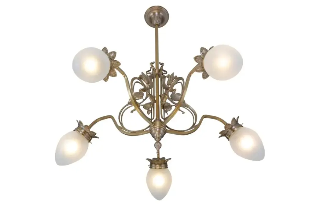 Lyon 5 is a 5 armed chandelier made of brass available in different finishes.Finishes: Antique, Shiny brass, Matt brass, Shiny nickel, Matt nickelCapacity : 5x75 W E27The enormous, majestic 45 and 20 armed chandeliers of this collection feature round, cut glass shades and they boast flamboyant bucolic decor. They fit best in a large reception hall or a foyer. The charming little brothers of them fit beautifully in an average dining room, creating a majestic atmosphere. The table lamp of the LYON collection is especially gracile.