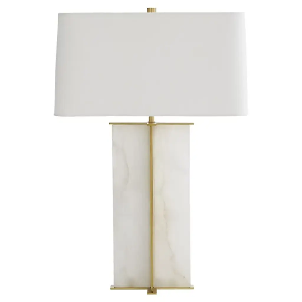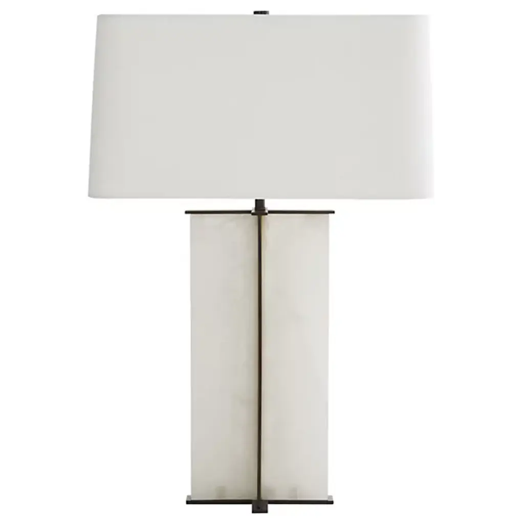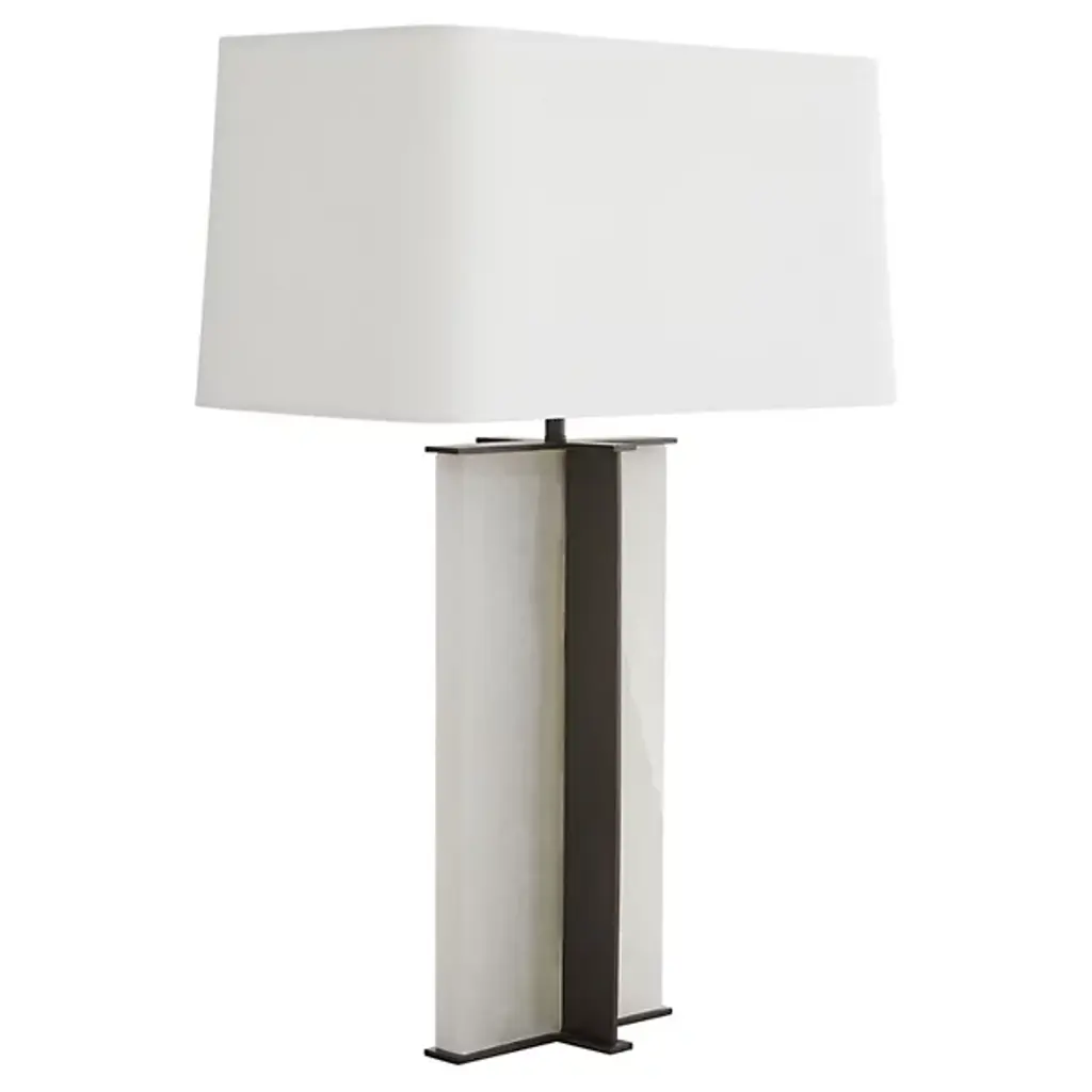 Bring a luxurious accompaniment to inside surfaces with the sleek, angular lines of the Lyon Table Lamp from Arteriors. Starting with a base and body sandwiching rectangular panels of rich alabaster between slim cross-shaped steel accents, it raises strong lamping controlled by a socket switch beneath a slightly-flared linen drum shade. The soft shade contrasts well with the smooth alabaster below, which takes on an elegant luster from direct downlight transmitted through the shade’s open base.