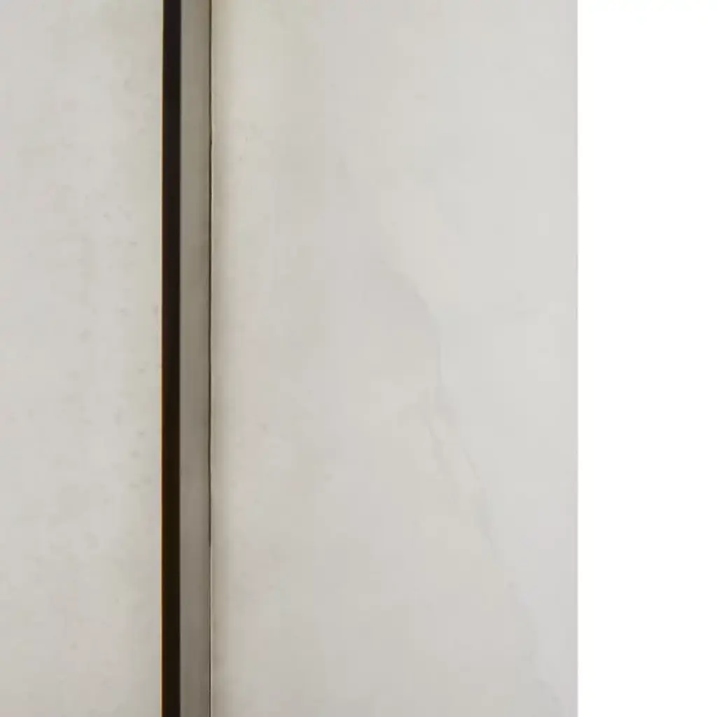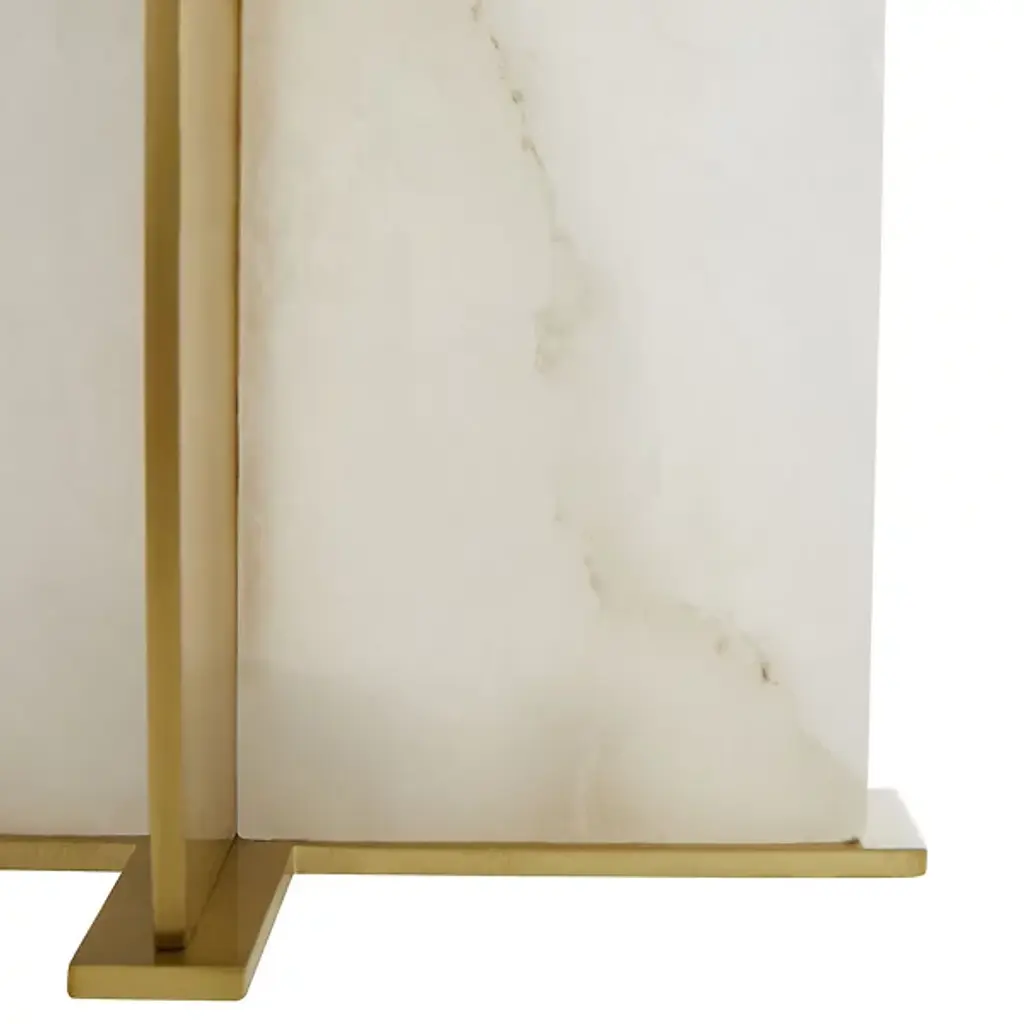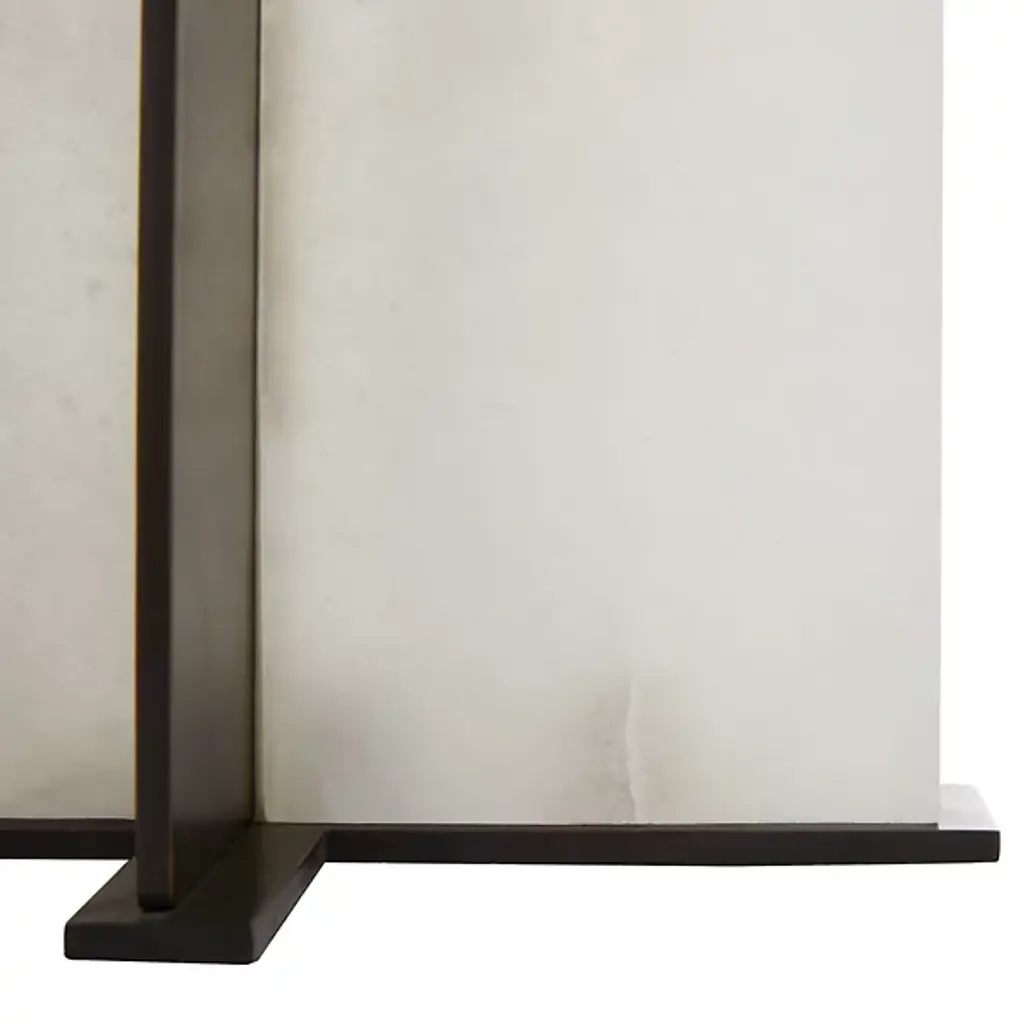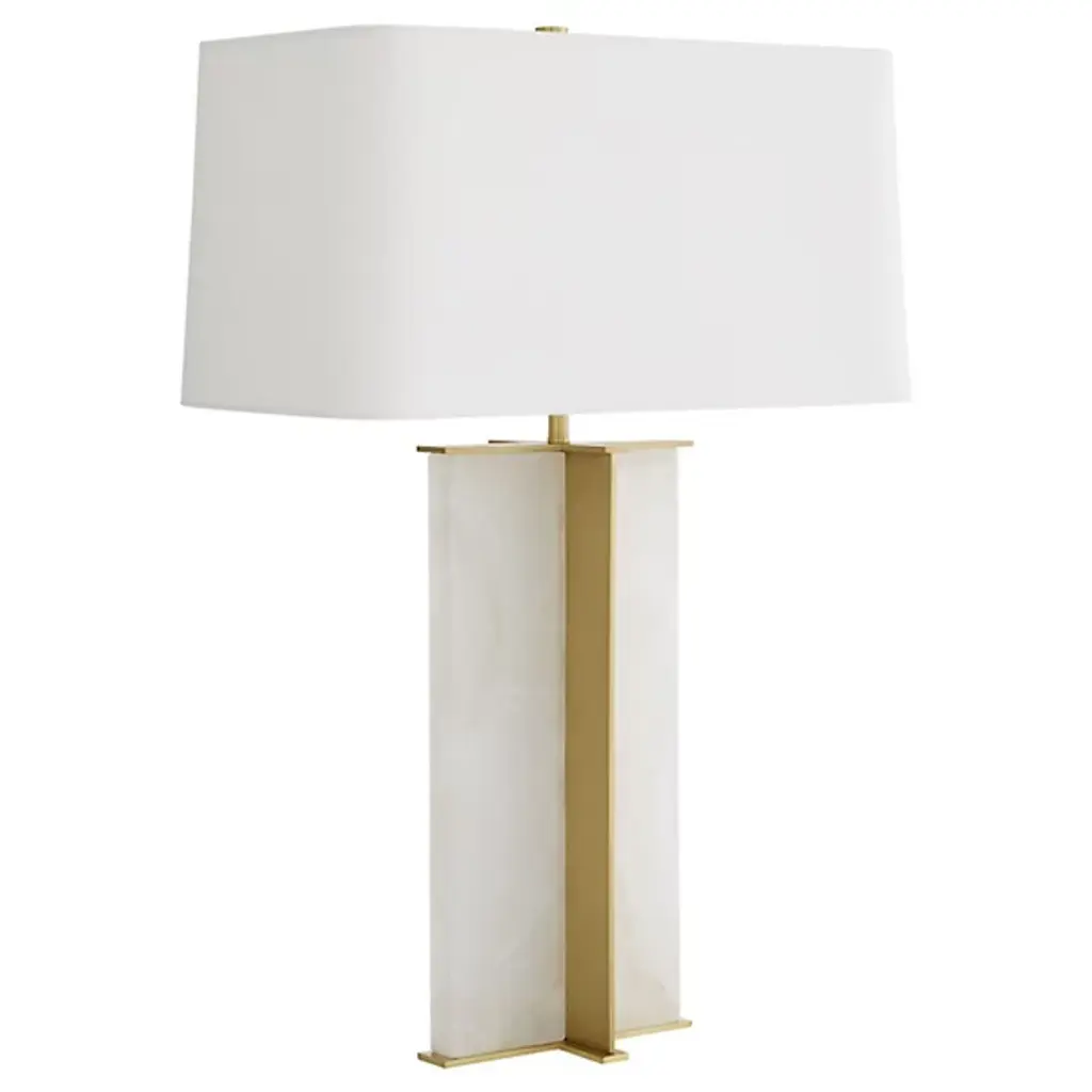 Bring a luxurious accompaniment to inside surfaces with the sleek, angular lines of the Lyon Table Lamp from Arteriors. Starting with a base and body sandwiching rectangular panels of rich alabaster between slim cross-shaped steel accents, it raises strong lamping controlled by a socket switch beneath a slightly-flared linen drum shade. The soft shade contrasts well with the smooth alabaster below, which takes on an elegant luster from direct downlight transmitted through the shade’s open base.
