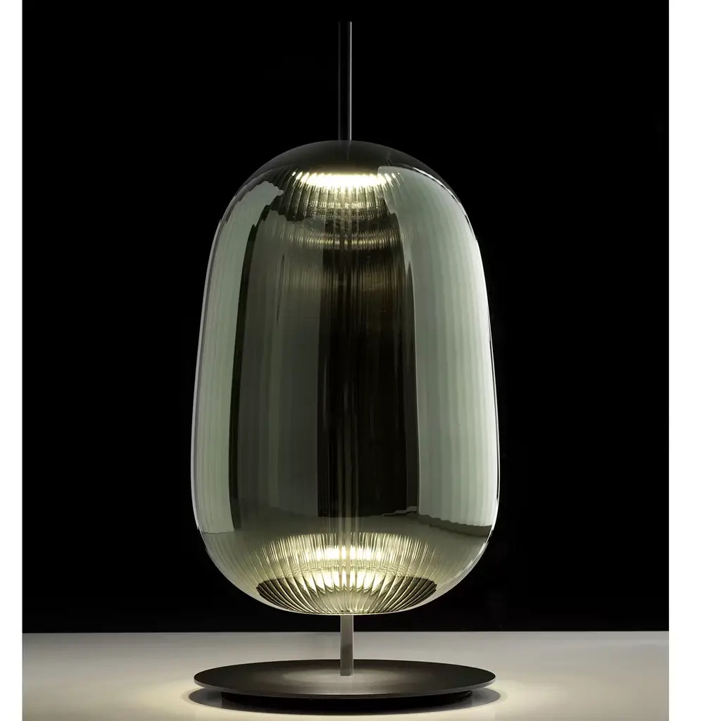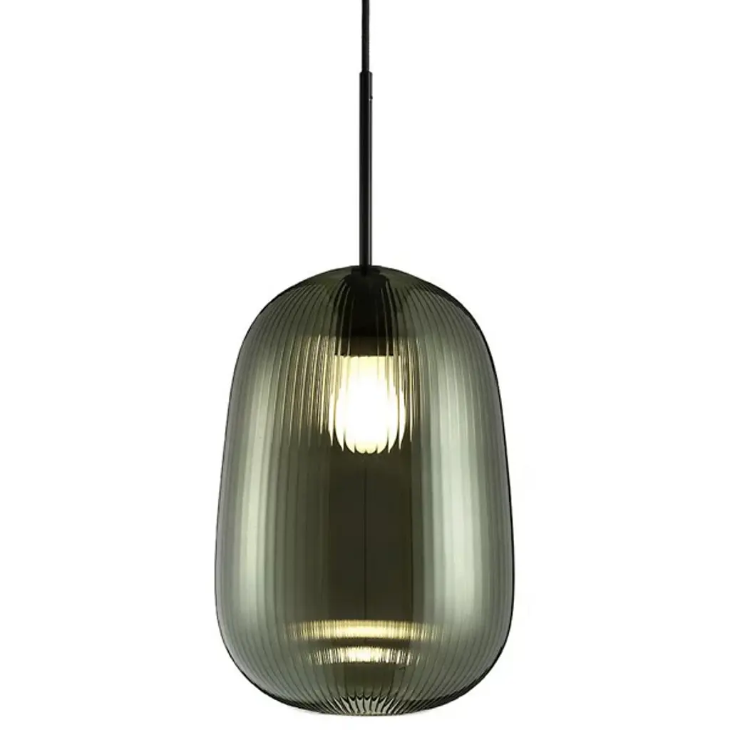 Infusing any room with a sophisticated lounge vibe, the Maat Emerald Green Table Lamp is topped by a tiny LED that illuminated the ribbed glass shade to create unique refracted light. The shade is also available in frosted white glass. A pendant version of Maat is also available. Light source: 7 W LED 2700 K. Cable: 200 cm