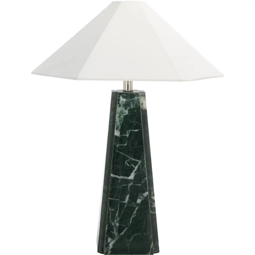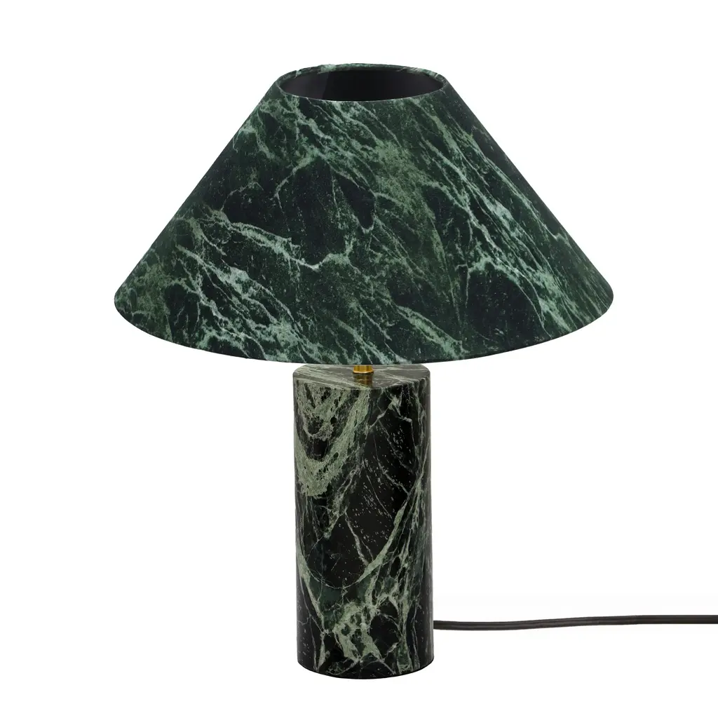 The Mable Marble Table Lamp redefines style with its flawless fusion of solid marble and high-tech design. Its color-accurate digital printing technique creates the illusion of a lamp chiseled straight from the heart of a mountain, allowing light to filter through in a mesmerizing display. Crafted using the exquisite Red Levanto and Spider Green marbles quarried in India for both the base and fabric pattern, this tone-on-tone masterpiece brings a touch of majestic beauty to any space.Features: