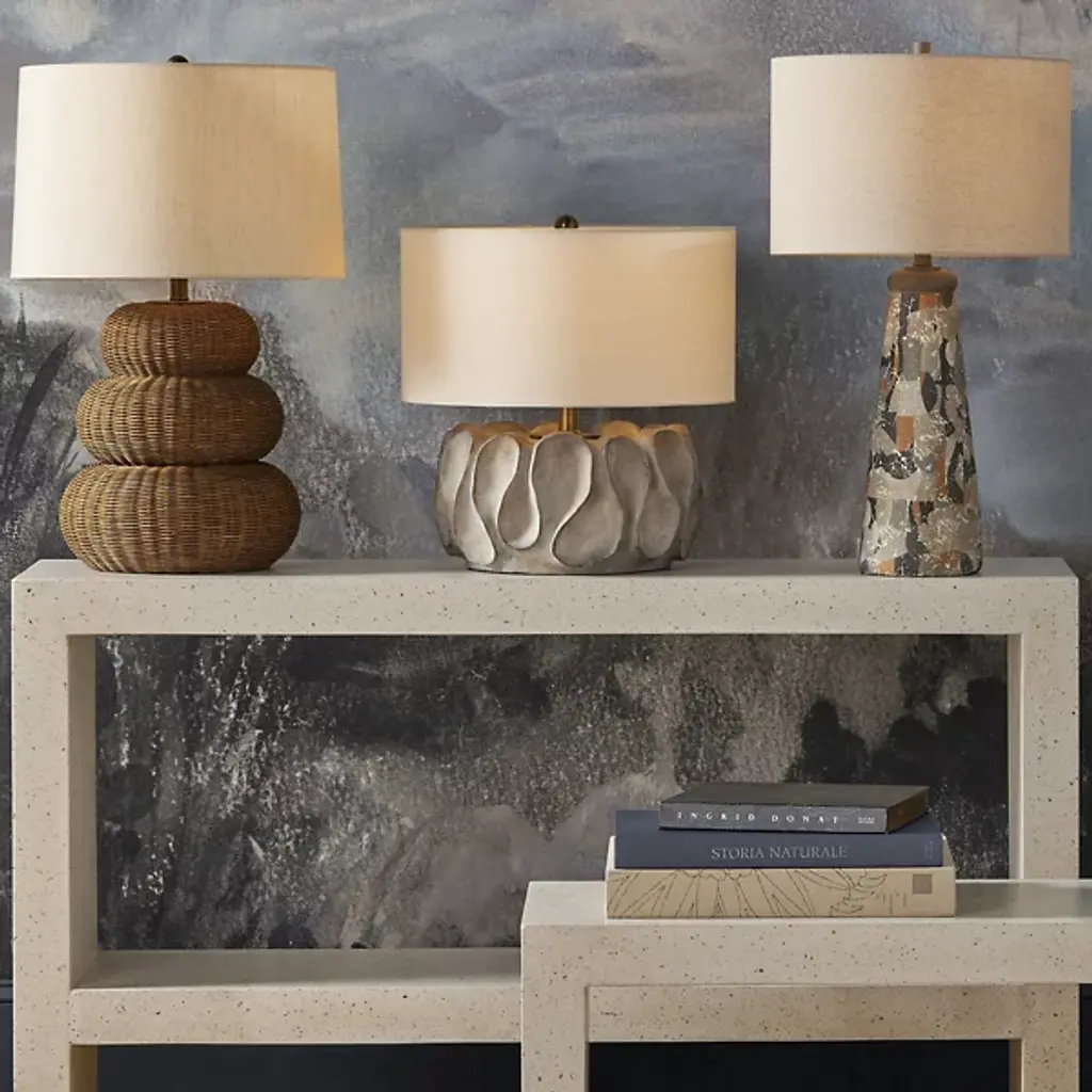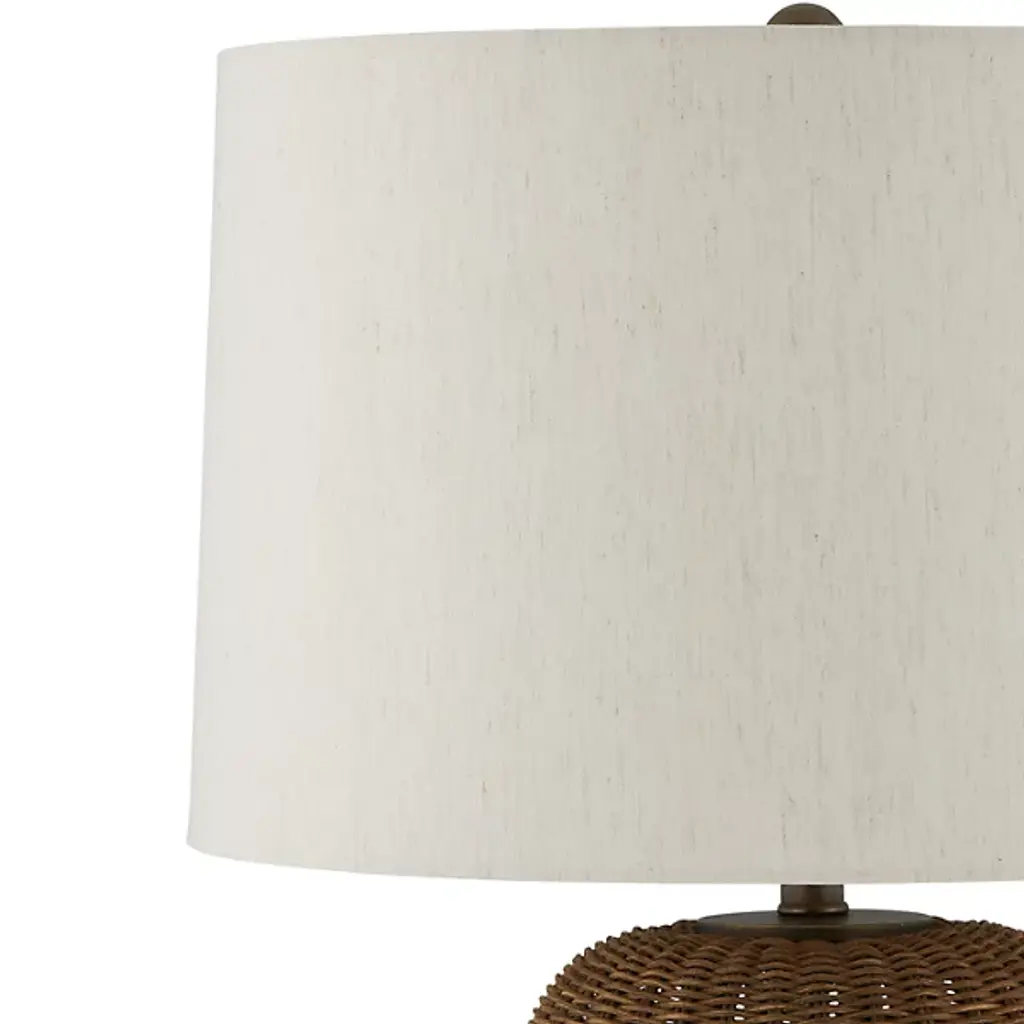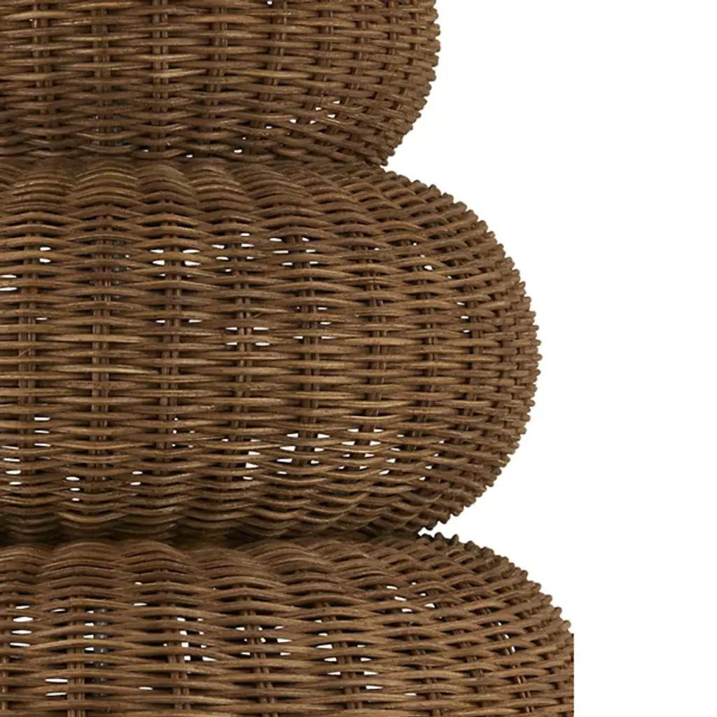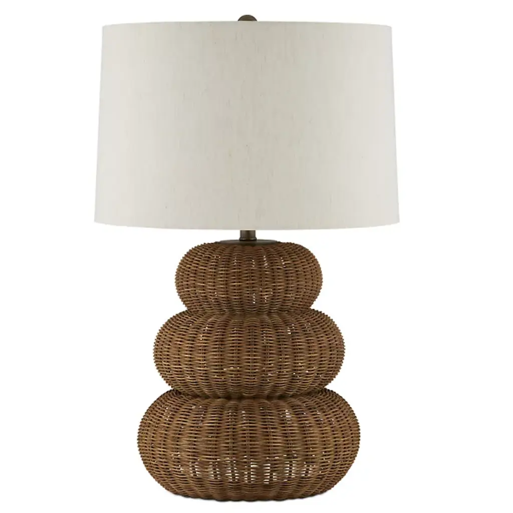 The Mabrouka Table Lamp from Currey & Company features texture with woven natural materials. Crafted from rattan, its triple-gourd shape and rich dark brown finish bring warmth and personality to any space. The lamp's hardware and finial feature an antique brass finish that harmonizes perfectly with the color of the wicker weave, enhancing its natural appeal. This lamp is perfect for adding organic charm and tactile interest to interior settings.