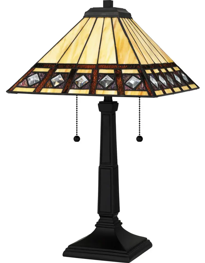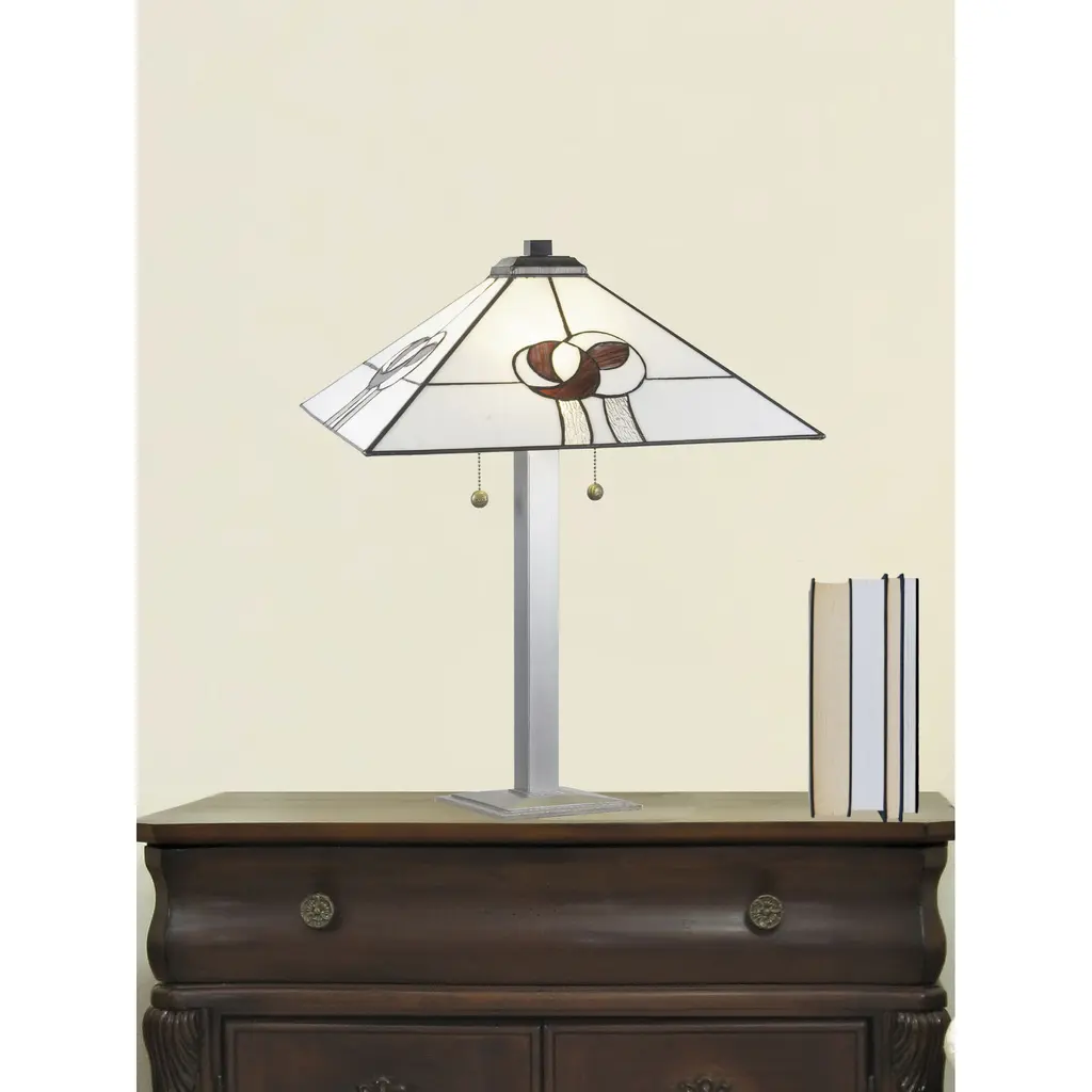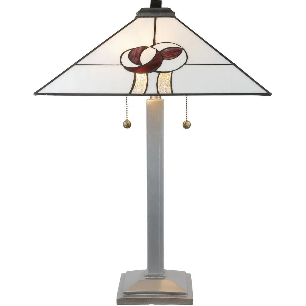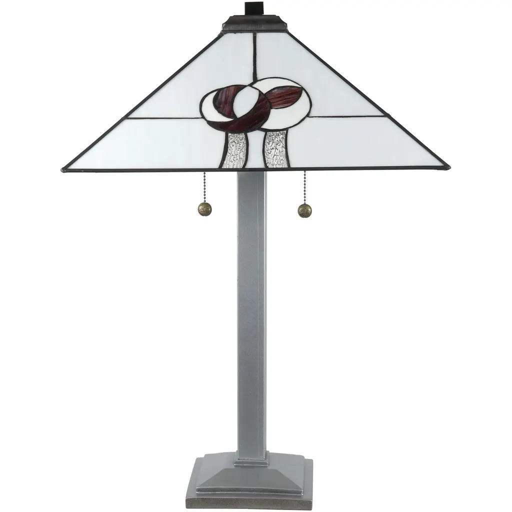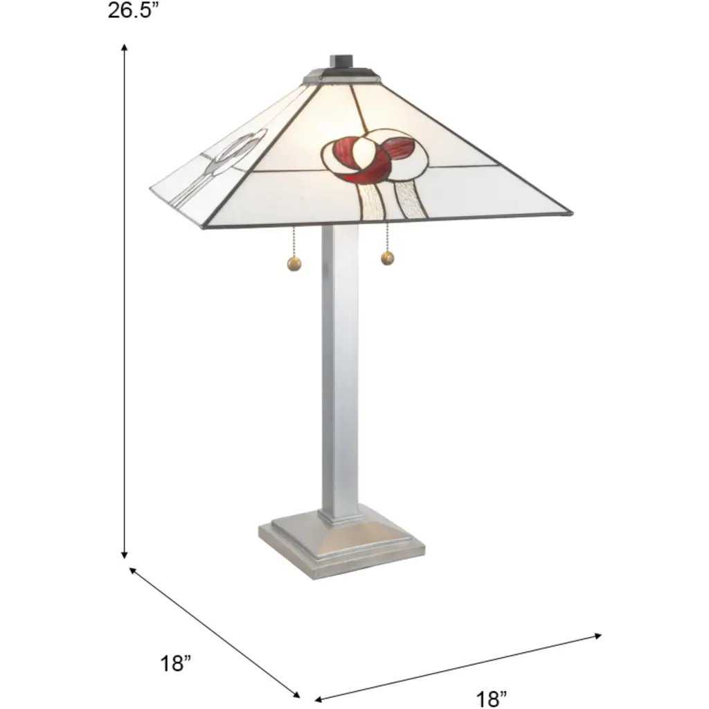 Part of our Mack Rose collection, the Mack Rose Tiffany Table Lamp is a harmonious blend of classic artistry and contemporary design. Crafted with meticulous copper foil soldering on Tiffany stained glass, the lamp showcases a Mission style square design, a nod to timeless elegance. The shade features a serene palette of white and gray, beautifully juxtaposed with the distinct Mack Rose design, adding a touch of botanical charm to its geometric form. The base, sculpted from resilient resin, is adorned with a lustrous silver painted finish, providing both stability and a modern flair to the piece. Standing proudly at 26.5" in height with a broad 18" wide shade, the Mack Rose Tiffany Table Lamp is more than just a lighting accessory it's a statement of sophistication, perfect for gracing any room with a blend of tradition and modernity.