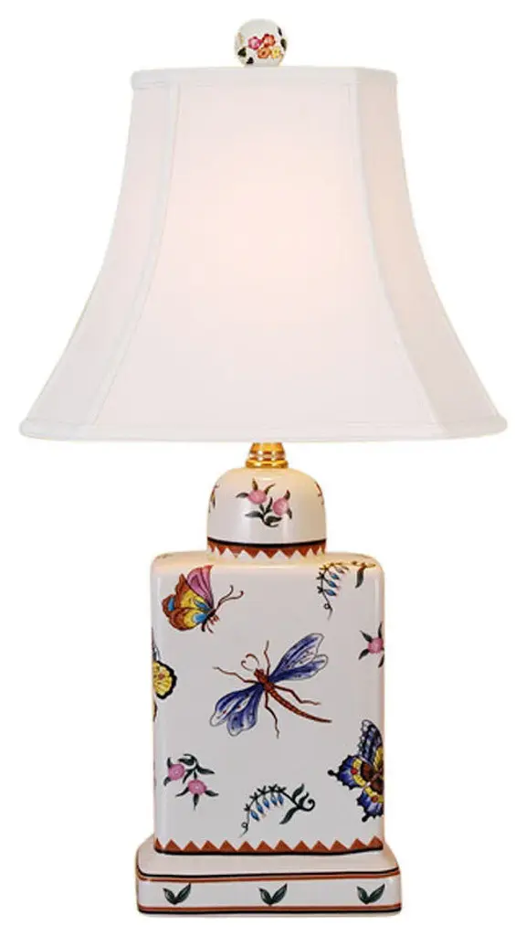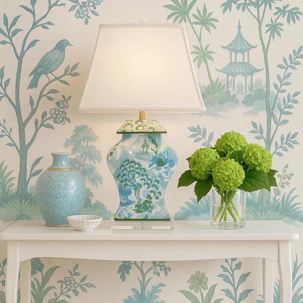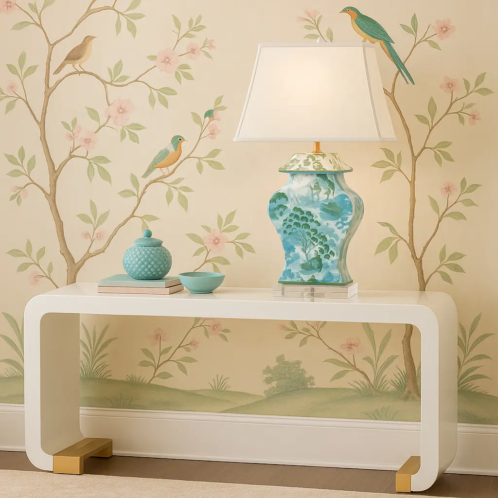 John Loecke of dynamic design duo Madcap Cottage painted the whimsical chinoiserie-influenced motif that adorns this porcelain table lamp. Resting on a clear acrylic base, the lamp is topped with a cotton-and-linen shade that accentuates its shapely silhouette.