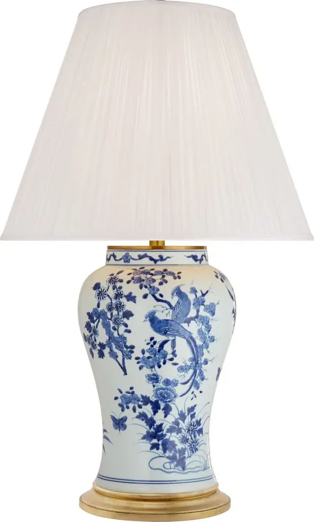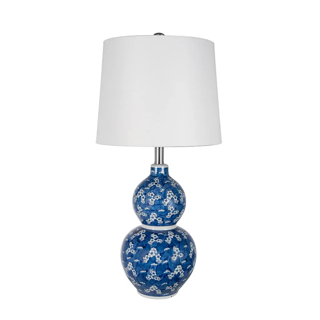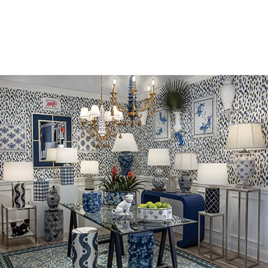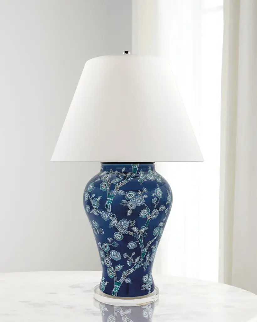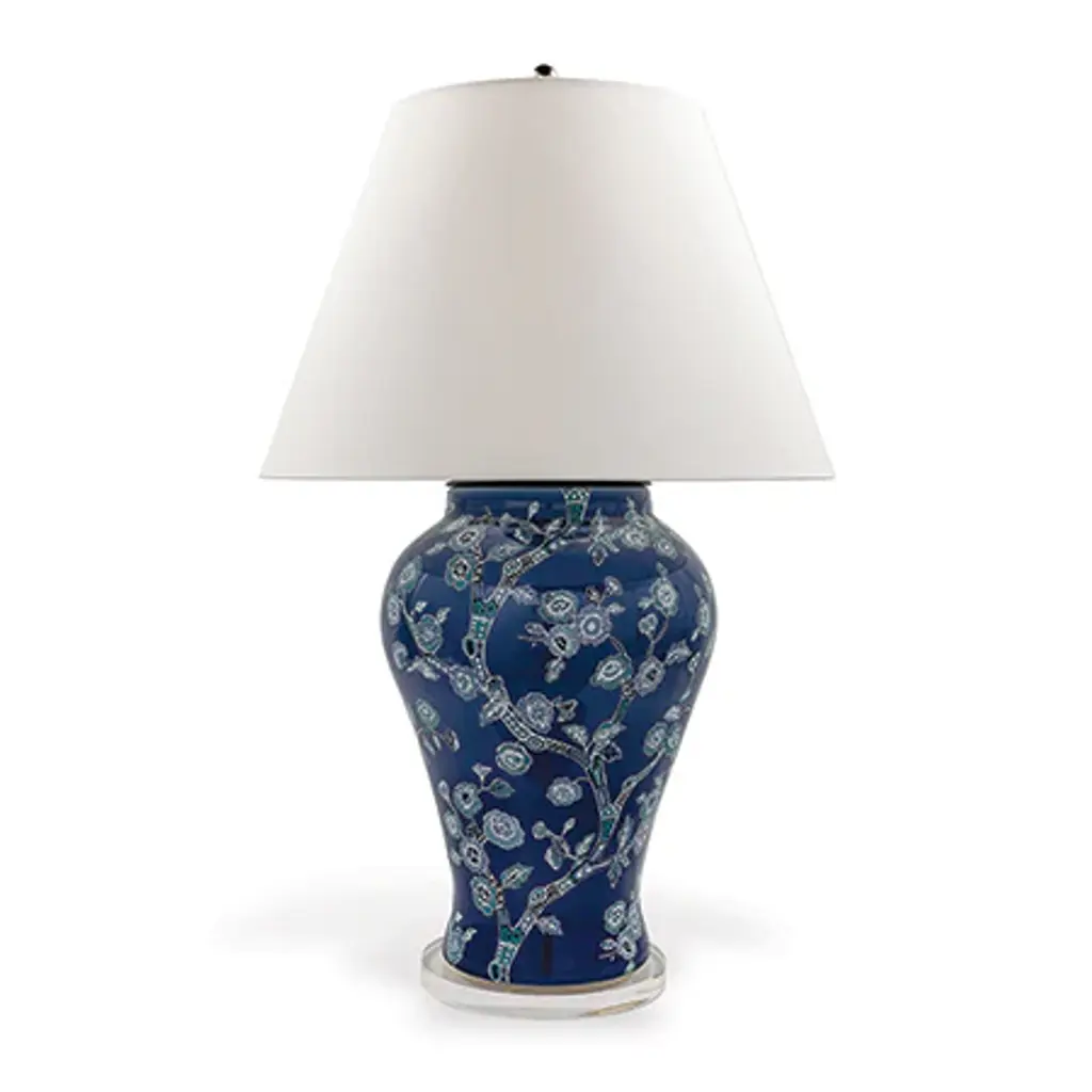 Did you know that Madcap Cottage designer John Loecke hand paints all of the original patterns at his firm? Inspired by travel and history, Temple garden is one of our new favorites. The bold blue pattern makes you dream of far-off gardens in exotic lands where peonies reach skywards and floral vines ramble over the countryside. Exceptionally rich, the blues are the complement to any design scheme. Accented with a wood lamp cap, this grand lamp is accented with a lucite base and nickel hardware. Metal ball finial. 3 way switch. 150 max bulb. Shade: Tapered hardback shade. 12" top x 23" bottom x 15" SH. T Textured off white polyester fabric. Materials: porcelain, lucite Ships via FedEx Free shipping in the U.S.