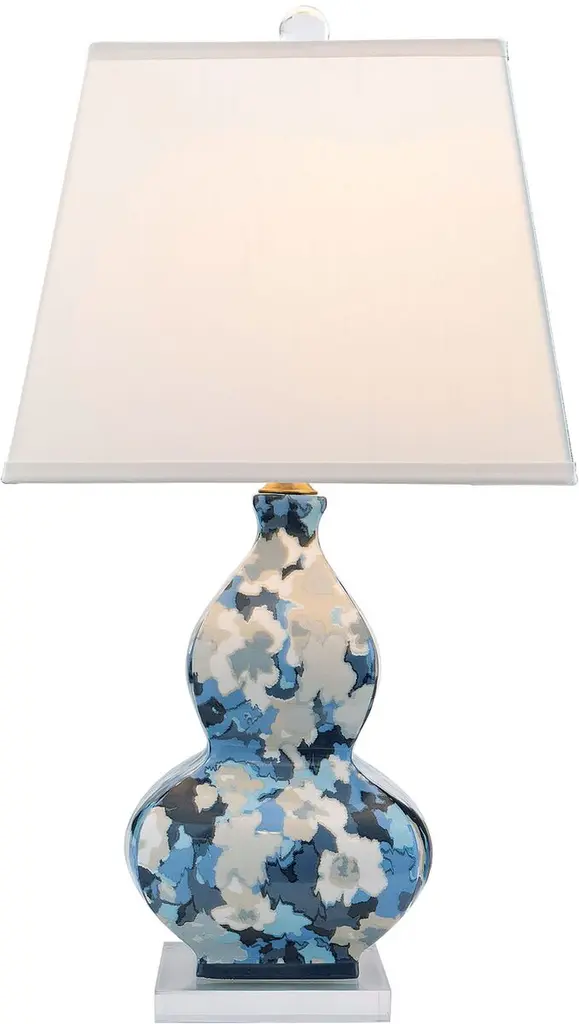 An English country home inspired the floral motif on this porcelain table lamp. Designed by Madcap Cottage, the curvaceous lamp rests on a clear acrylic base and is topped with a tapered rectangular shade.