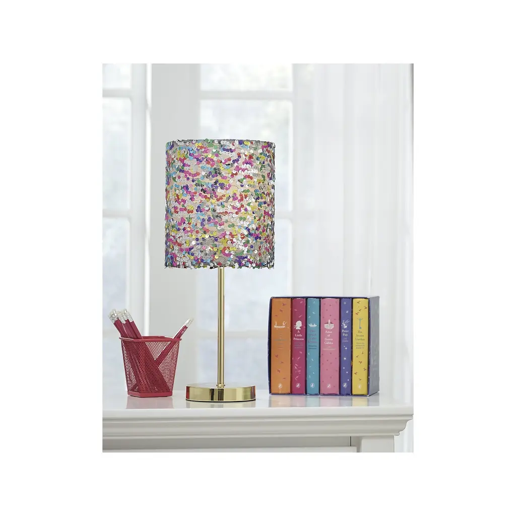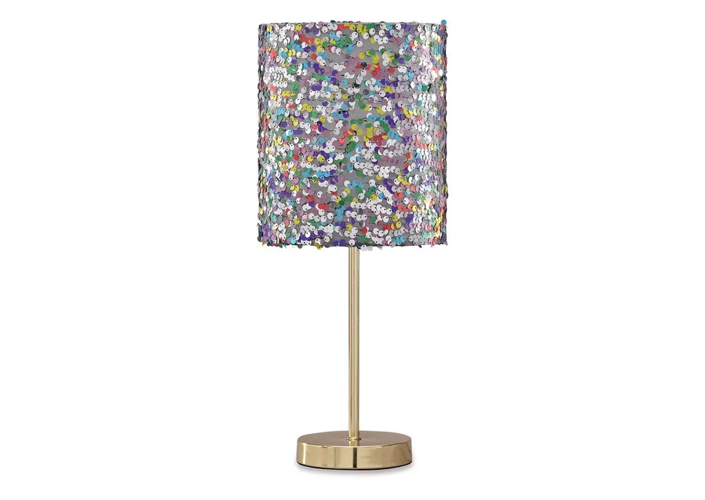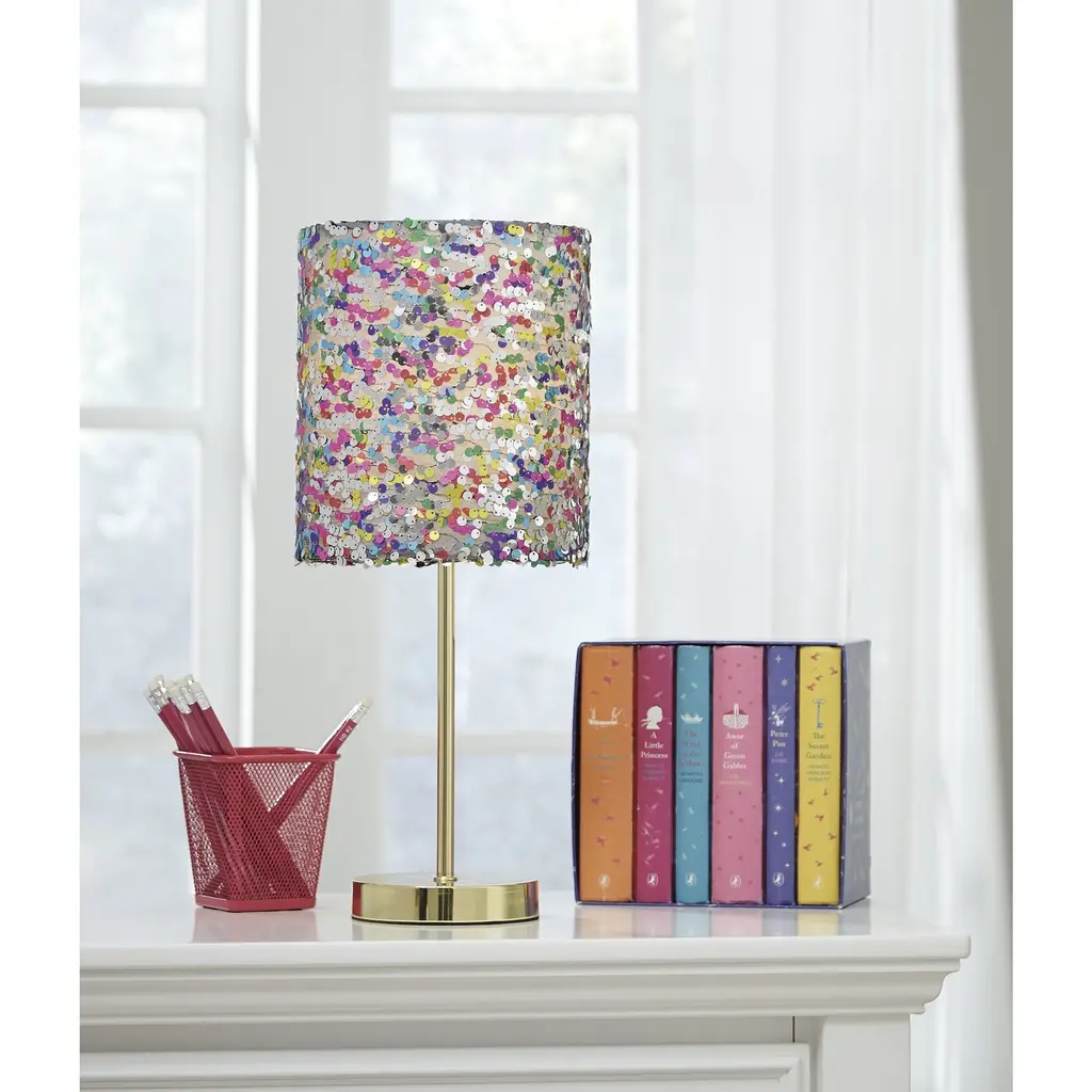 Accentuate your little one's whimsical bedroom with the Maddy sequined table lamp from Signature Design by Ashley. The multicolored sequin accents glitter and shine and the lamp is lit up, which is perfect for adding a cheery and playful vibe to a space. The supporting metal base adds glamour to its minimalist silhouette with its goldtone finish.