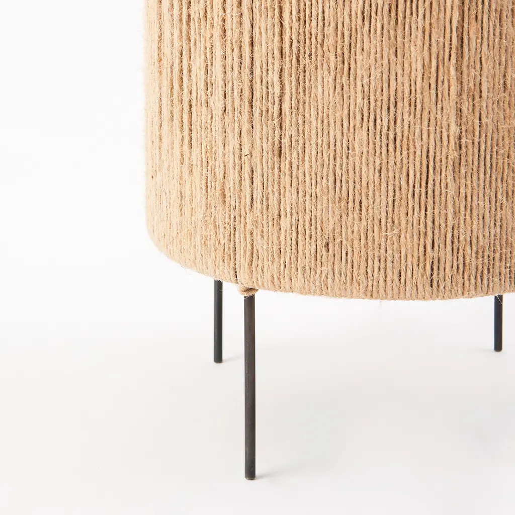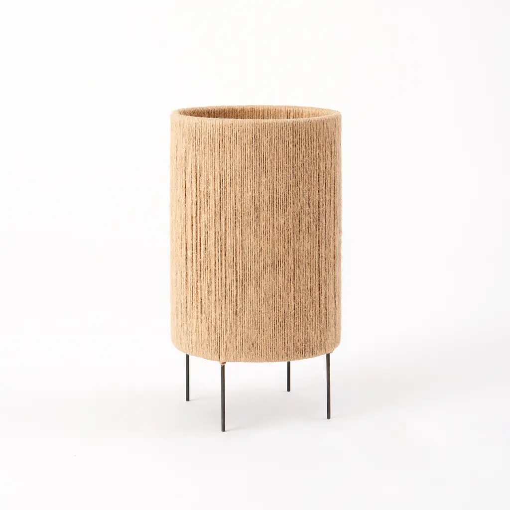 Create a cozy ambience in your home with the hygge-inspired RO Table Lamp from Made by Hand. Designed by Kim Richardt, the lamp gives a nod to the traditional lamp shades of 1920s-1930s, which Danish artisans crafted with natural yarn shades. The RO series features an exceptionally warm and tactile material that becomes even more beautiful when it’s brightened from within: natural jute. Each handmade table lamp features a cylindrical shade created by wrapping jute yarns over two blackened iron rings. Four thin legs provide excellent support. The largest table lamp from the collection, this product is perfect for shelves, tables, windowsills, and even floors. Pendant lights and a floor lamp with the same design are also available.
