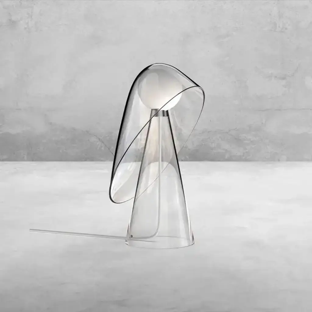 Mademoiselle transparent black table lamp by Mason EditionsDesigned by Quaglio Simonelli.Dimensions: Ø 21.8 cm x H 30 cm.Materials: transparent black Pyrex borosilicate glass.All our lamps can be wired according to each country. If sold to the USA it will be wired for the USA for instance. Mademoiselle is a crystalline lamp. The superposition of transparent elements sketches an evanescent Silhouette.The lampshade drops backwards and rises at the front of the lamp to partially discover the luminous sphere.The perfect transparency of this veil makes it possible to see every detail of the object in all its purity. A same support can be dressed by lampshades of changing shapes, that confer different personalities to the lamps.Available in transparent, grey, black transparent and green transparent. Mason Editions comes from the experience of an Italian lighting company placed in the Veneto region.This new brand of furniture elements was born from the meeting between the entrepreneur Fabio Mason and three international designers who designed the first collection for a sophisticated public. Therefore the collection wants to be eclectic and timeless.The Material contrast and fresh design, with essential shapes, mark the mason editions collection.In conclusion, the elegant Italian sign highlights proposals suitable for all environments.Mason editions is a set of experiences, artisans, and productive know-how that creates a capable system.