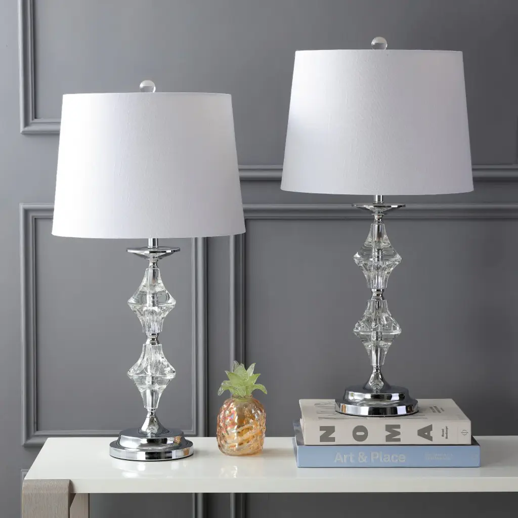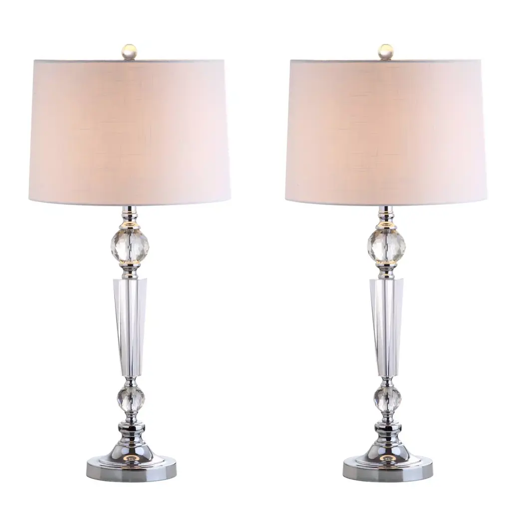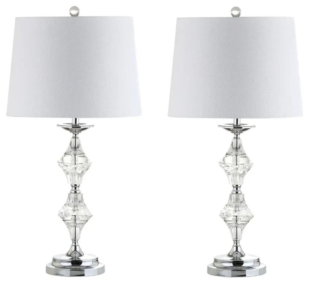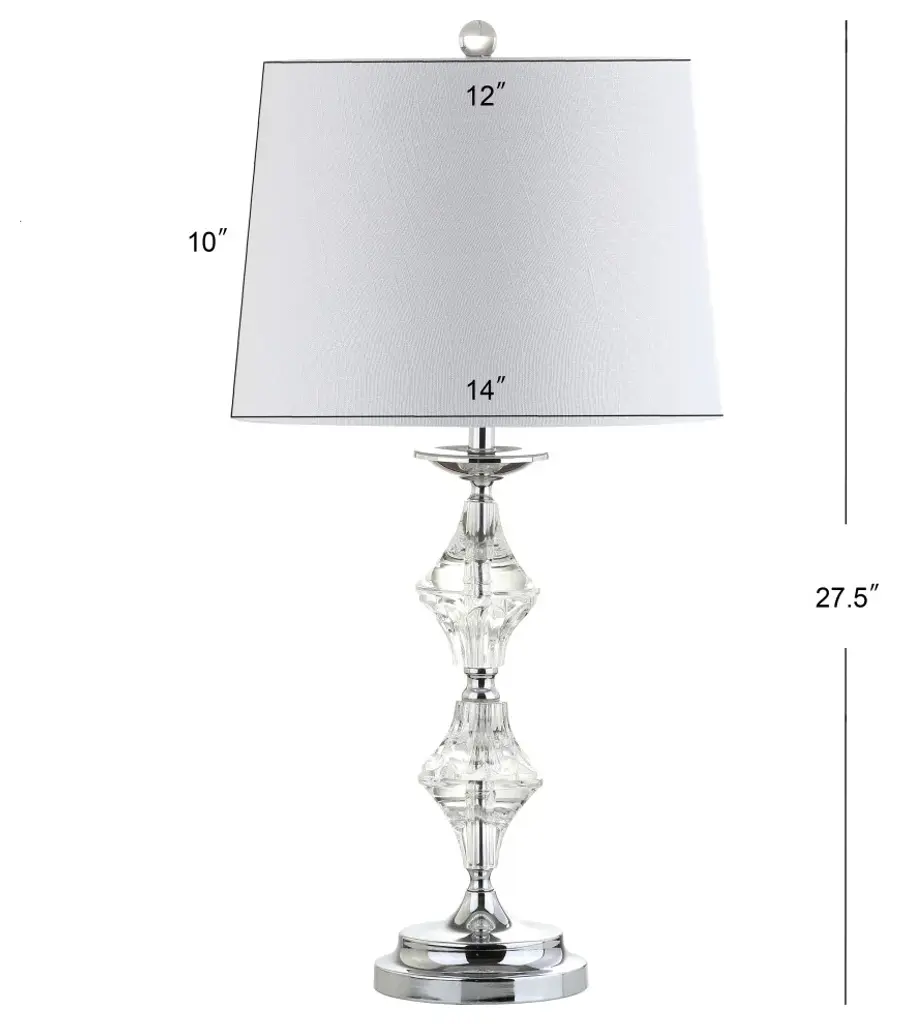 Make room for traditional elegance, as a column of crystal stacks up and sparkles from every angle. The round crystal base of our lamp continues the aesthetic in gleaming chrome while a slightly tapered linen shade enhances the light''s reflection. Topped with a crystal finial and finished with a silk-wrapped 60" cord, this lamp will add traditional glamour to any home. -Classic crystal styling works with any style of dcor or color scheme-100% cotton hardback drum shade with a slightly tapered shape-60" silk cord with standard USA 2-prong plug -On-off switch on socket-Takes one maximum 100 watt or equivalent bulb -Eco-friendly 9W LED bulb included-UL Listed-Color: Clear/chrome with white shade-Body Material: Crystal-Base Material: Iron-Finial Material: Crystal-Finial Color: Clear-Harp Color: Silver-Includes: Two (2) lamp(s)-Minor Assembly Required-Lamp: 27.5 inches high x 14 inches wide x 14 inches deep-Shade: 10 inches high x 14 inches wide x 14 inches deepAbout us: You see a lamp.We see a decorative work of art.A perfectly curved shade casts a dramatic shadow on a floor. A silk cord you never want to hide. LED lightbulbs: as easy on the environment as they are on the eyes. The JONATHAN Y Lighting collection considers every detail from impeccably sourced materials to designer styling. And our prices are so attractive, we''ve transformed a functional necessity into a fashion accessory.JONATHAN Y Lighting a fashion revolution in home decor.