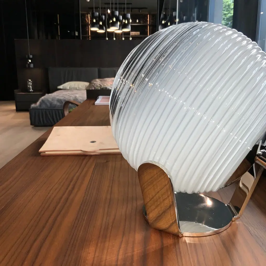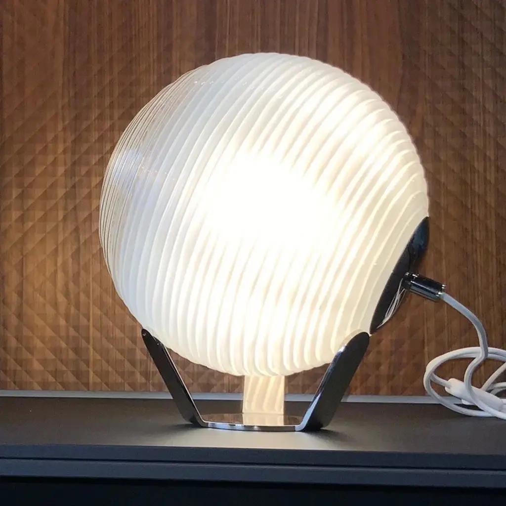 This exquisite table lamp of contemporary inspiration stands out for its spherical diffuser in mouth-blown Murano glass, offered in a shaded milky hue enriched with a wavy texture that enhances the light coming from an E27 LED bulb (220/240 V). Also available in a larger version, it rests on a gray-varnished metal base for a pedestal design that is airy and sculptural.