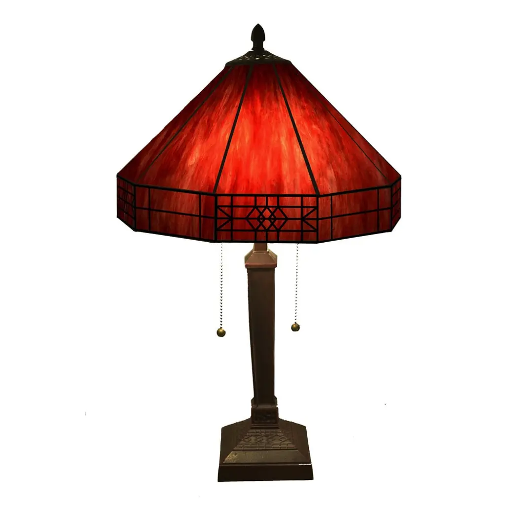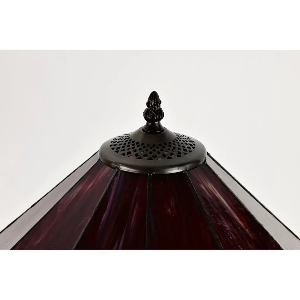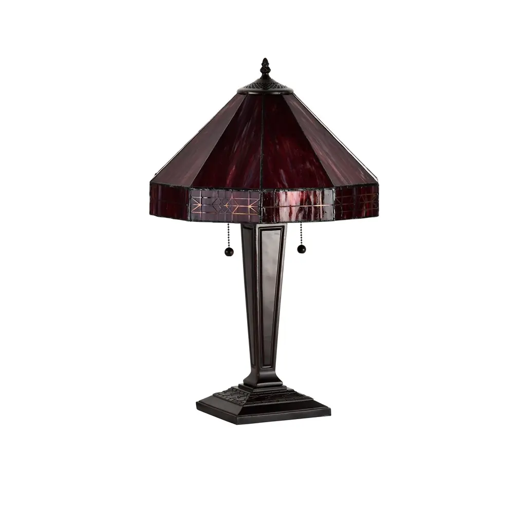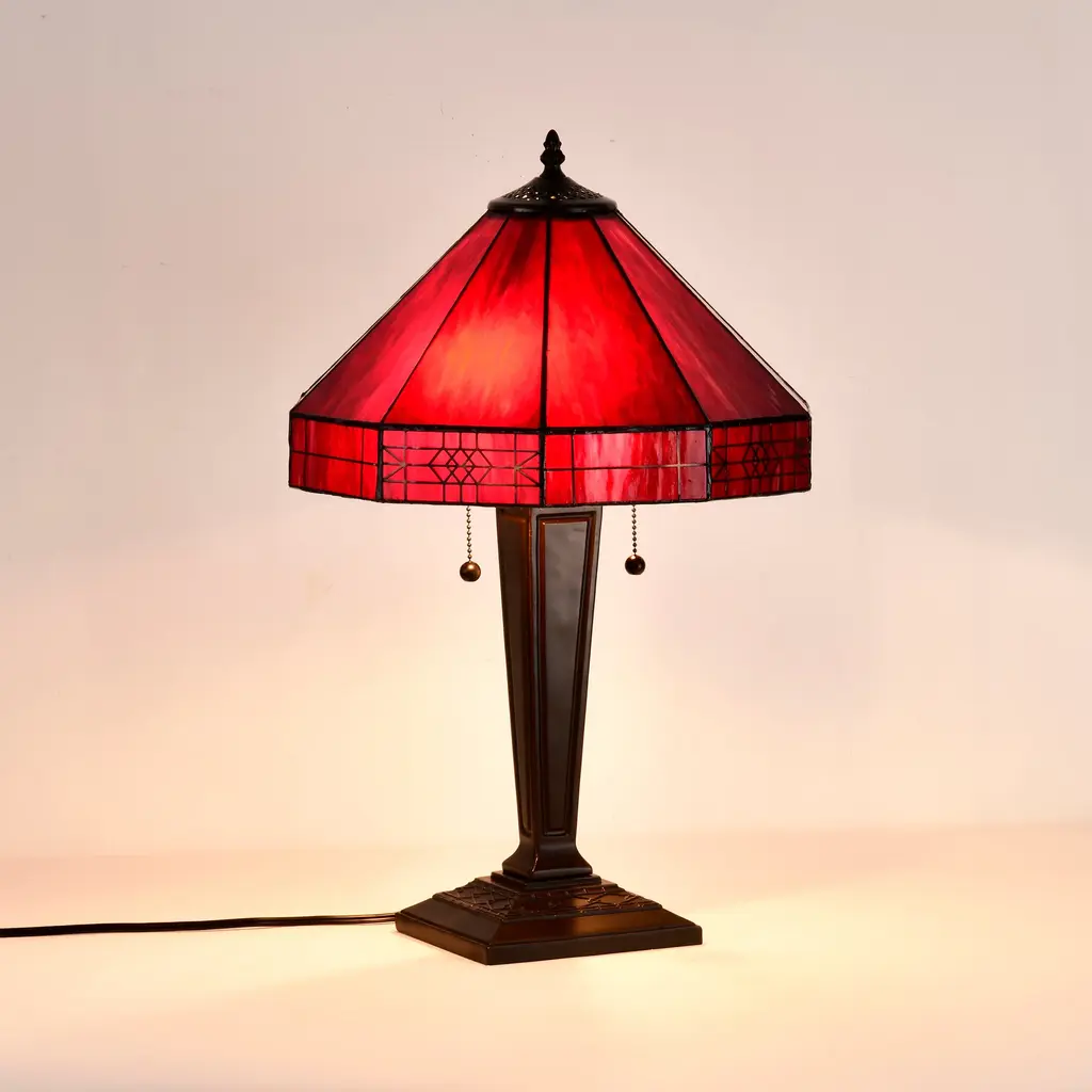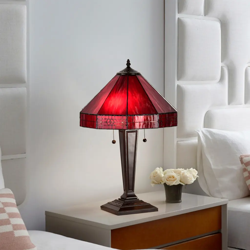 Bring a pop of color to your bedroom or family room with the Maeve Tiffany-style table lamp that features a gorgeous red stained-glass shade. This fiery decor is supported by a bronze-finished metal base to ensure years of service. Fitted with two bulbs, this indoor lighting offers additional illumination to your home with a twist of romance. Tiffany-style Stained glass Includes 30 inches wire Setting: Indoor Fixture finish: Bronze Shades: Stained glass, tiffany-style Number of lights: Two (2) Requires Two (2) 60-watt incandescent bulb (not included) Line switch Dimensions: 21 inches high x 14 inches wide x 14 inches high