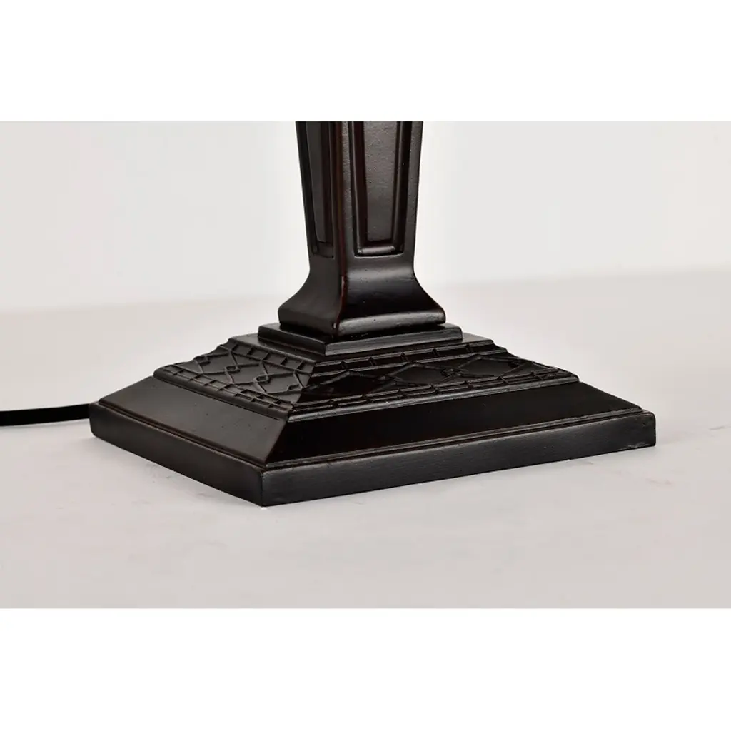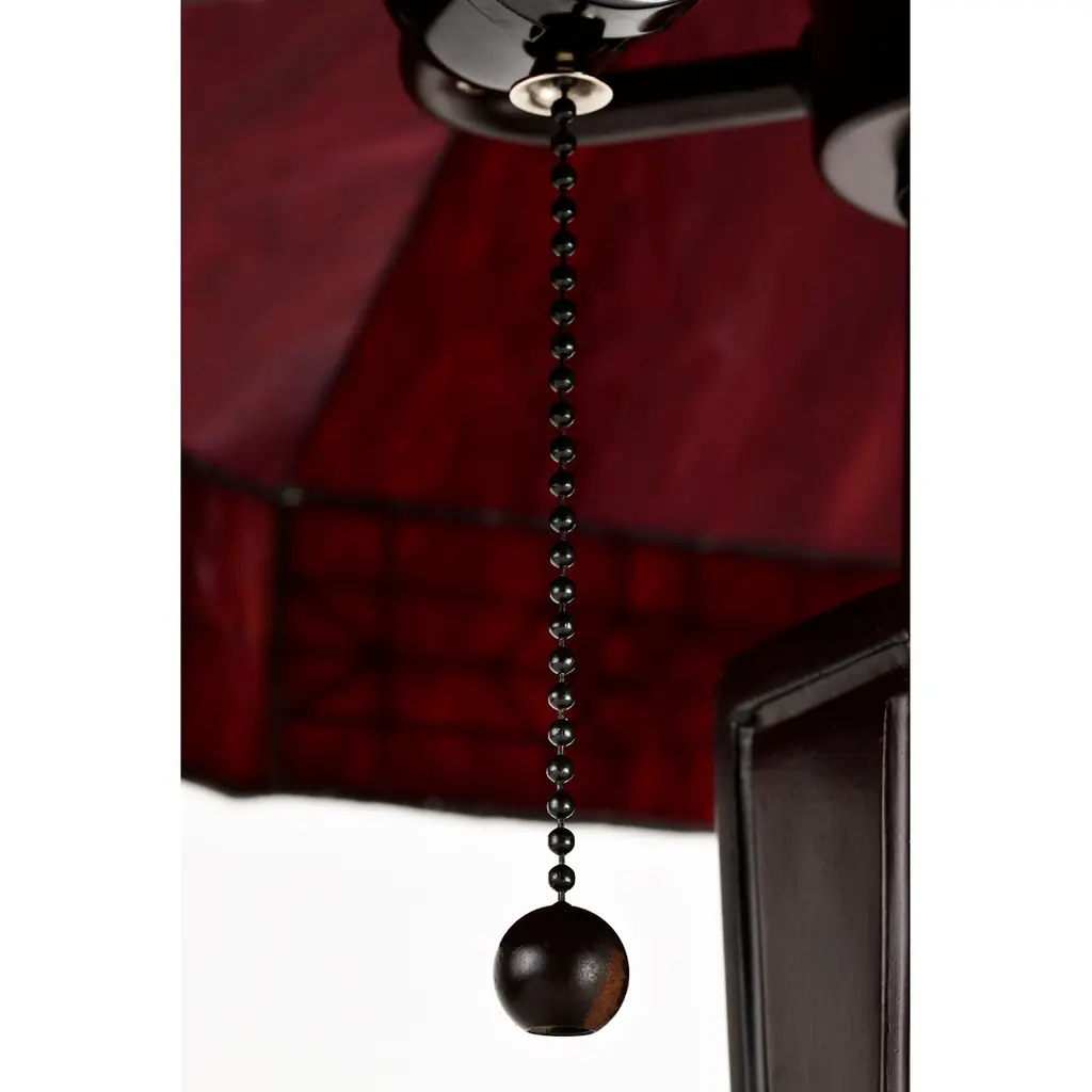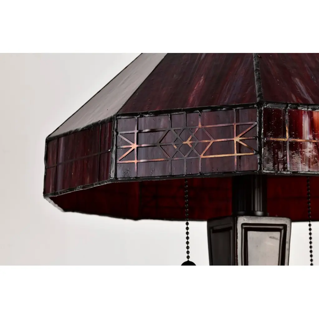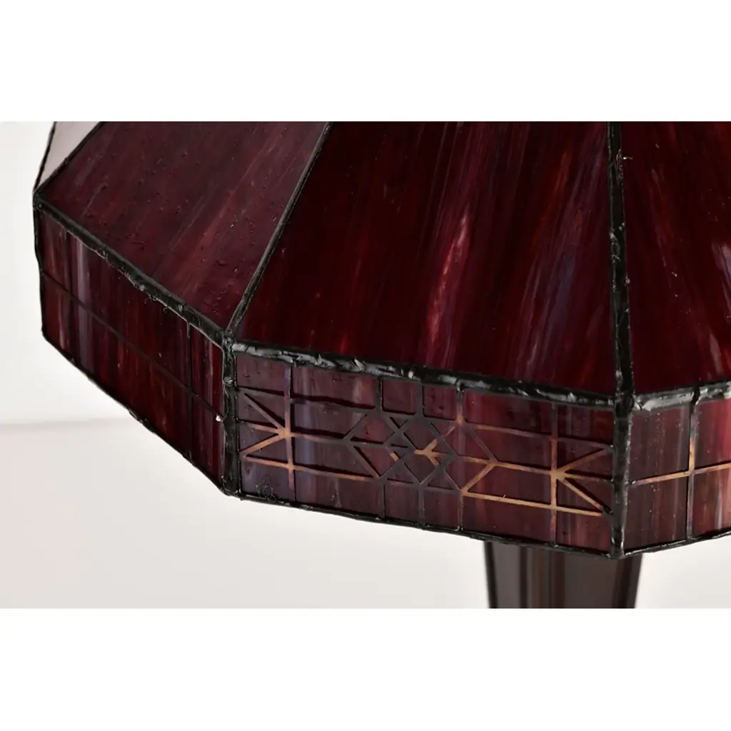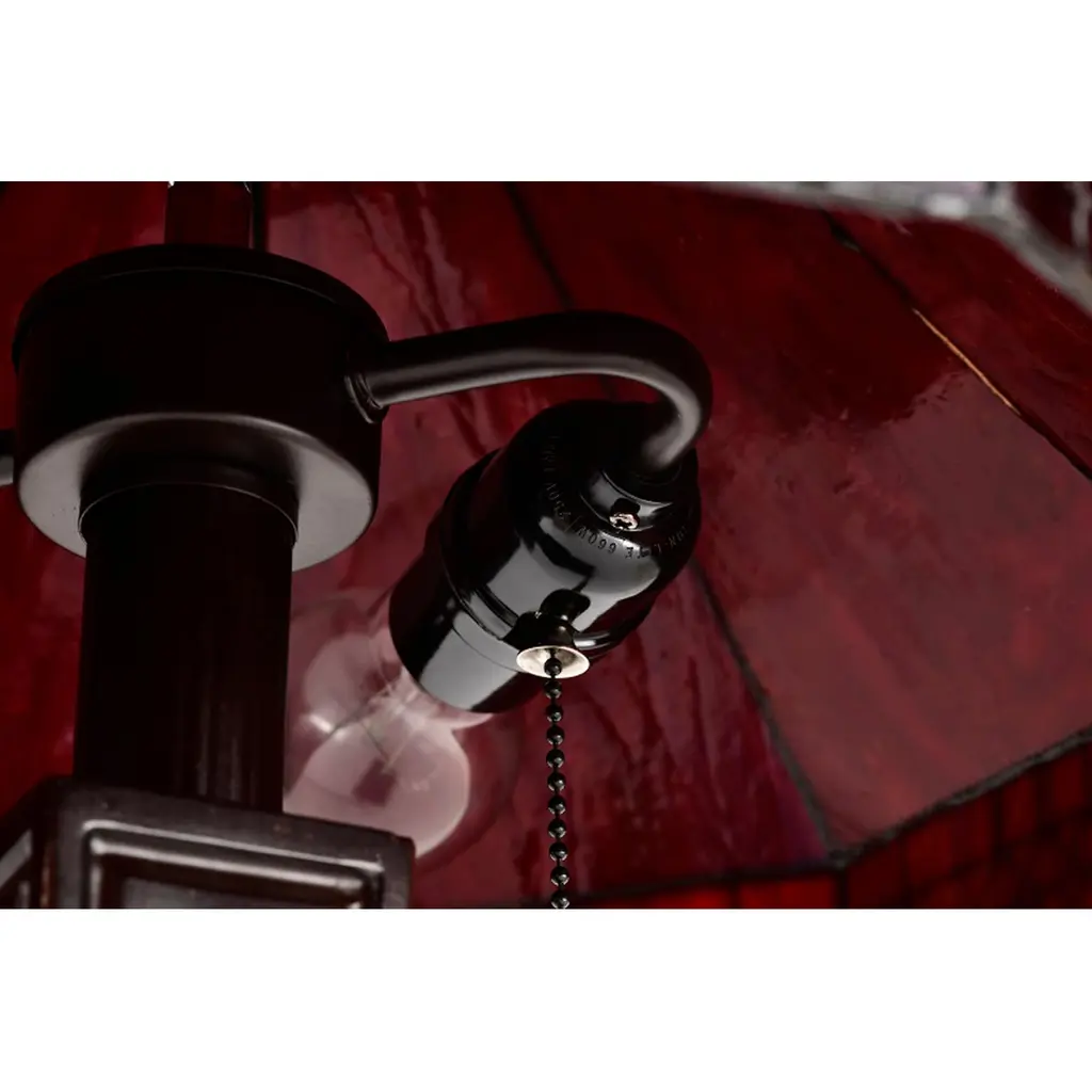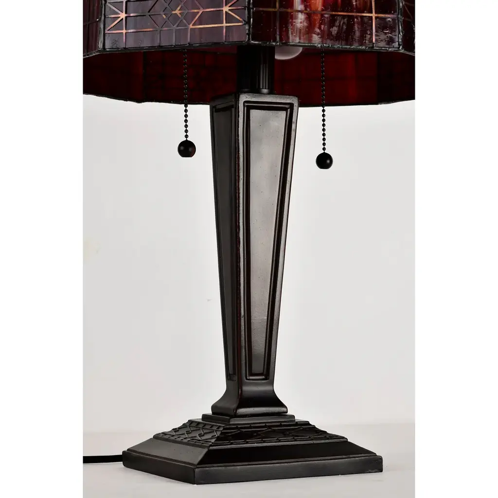 Bring a pop of color to your bedroom or family room with the Maeve Tiffany-style table lamp that features a gorgeous red stained-glass shade. This fiery decor is supported by a bronze-finished metal base to ensure years of service. Fitted with two bulbs, this indoor lighting offers additional illumination to your home with a twist of romance. Tiffany-style Stained glass Includes 30 inches wire Setting: Indoor Fixture finish: Bronze Shades: Stained glass, tiffany-style Number of lights: Two (2) Requires Two (2) 60-watt incandescent bulb (not included) Line switch Dimensions: 21 inches high x 14 inches wide x 14 inches high