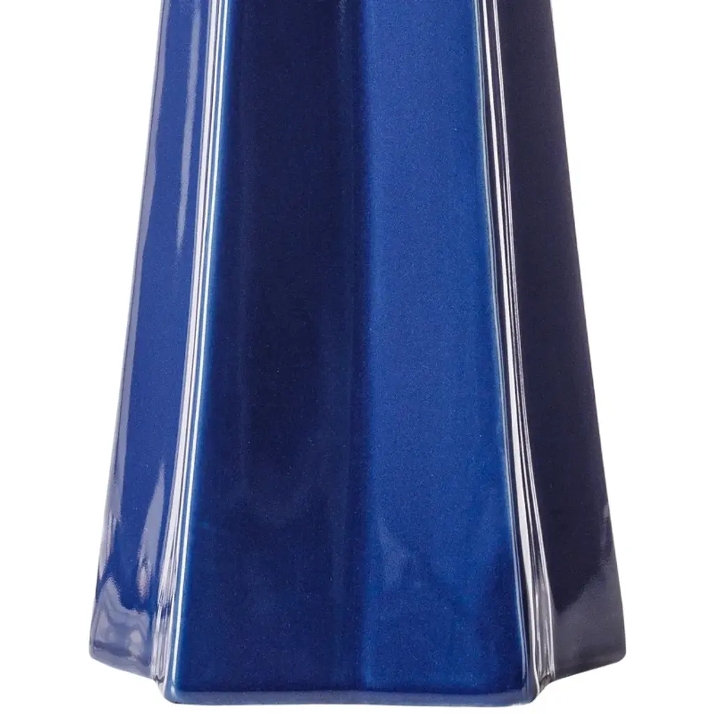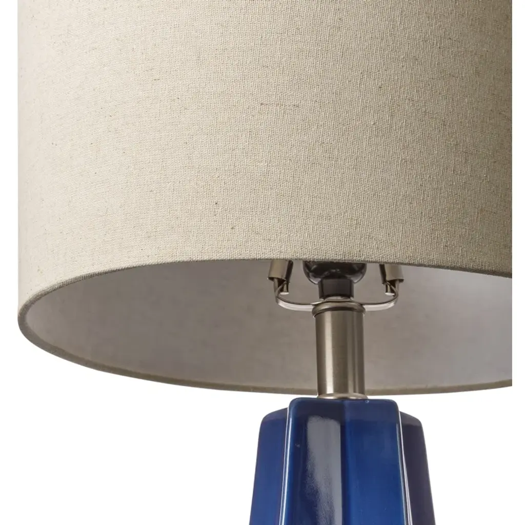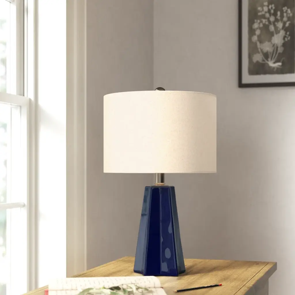 Add a sleek accent to your end table or nightstand with this contemporary lamp. With a funky-shaped base a star-inspired footprint, and a smooth, shiny finish, this table lamp has a bold, artistic look. The high-quality ceramic construction is durable and easy to care for, and the beige linen shade adds a bit of contrast and texture for added style. Made in China with a rotary switch and 6-foot cord length.