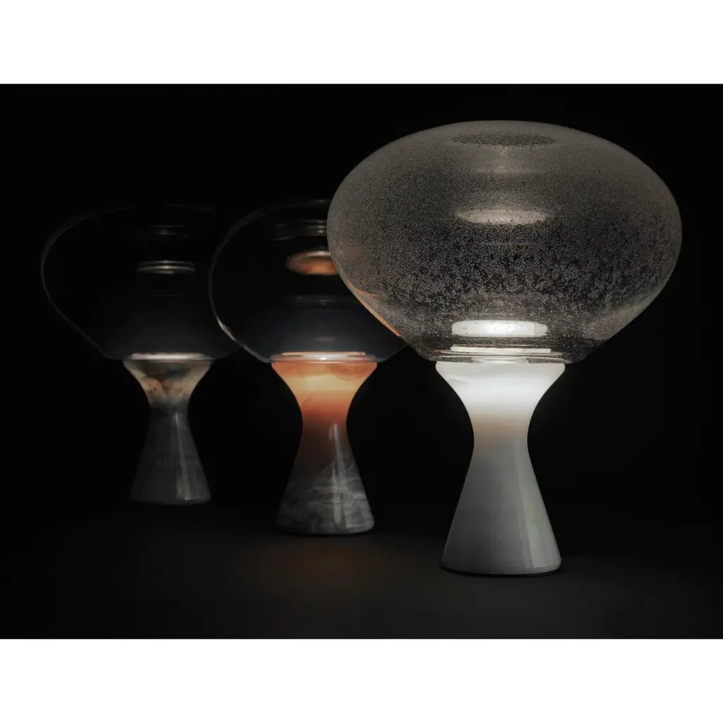 Magika Big Lamp by Kreoo Designed by Enzo BertiDimensions: Ø 36 x H 80 cm.Base: Ø 18 cm.Materials: Light Sky Onyx and grey gradient glass.Available in different marble, onyx, and glass options. Available in three different sizes. There are two glass sizes available. Please contact us.At the junction of tapered stem and transparent orb, light becomes a nearly volcanic incandescence, illuminating the magnificent veins of the onyx like a dawn or a sunset concealed by clouds.Equally incandescent is the glass blown by hand in the foundries of Murano, just as it was thousands of years ago, transformed into an organic form of transparent, fumed, or pulegone glass with an infinity of tiny air bubbles that bring sea foam to mind.Three styles, each with its lighting effect, plus a variety of heights and hues for the base.Kreoo: the new marble experienceKreoo links its name to the best Italian tradition in marble manufacturing and brings to new light the primordial charm of a material that has witnessed the evolution of civilizations and cultures.From the bathroom and living room to coverings, home accessories, and lamps, the company works with natural stone in various forms and aesthetic compositions, enriching it with other materials such as metals, wood, and glass. The result is a fascinating and chromatic language, suitable both indoors and outdoors. Expressed in contemporary but still customizable designs, Kreoo highlights workmanship know-how and excellence.The brand, born in 2010 by the experience of Decormarmi and its worldwide distribution strength, has led to major international projects, especially in hospitality and luxury residential.