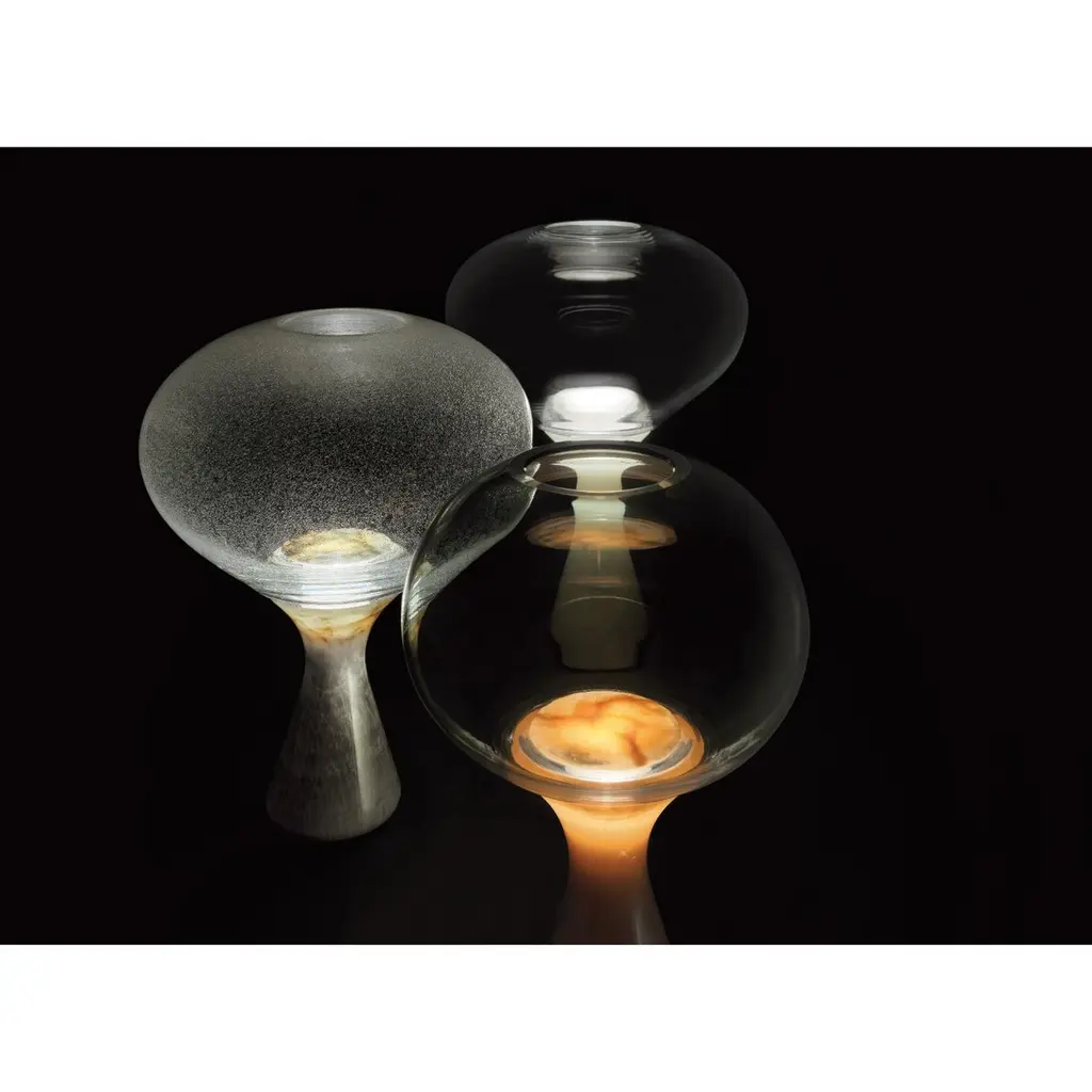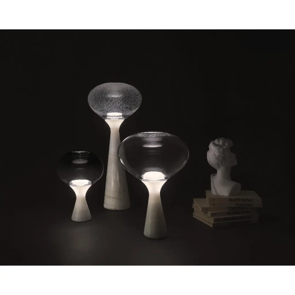 Magika Small Lamp by Kreoo Designed by Enzo BertiDimensions: Ø 36 x H 44 cm.Base: Ø 12 cm.Materials: Onice Bianco and Pelugoso glass.Available in different marble, onyx, and glass options. Available in three different sizes. There are two glass sizes available. Please contact us.At the junction of tapered stem and transparent orb, light becomes a nearly volcanic incandescence, illuminating the magnificent veins of the onyx like a dawn or a sunset concealed by clouds.Equally incandescent is the glass blown by hand in the foundries of Murano, just as it was thousands of years ago, transformed into an organic form of transparent, fumed, or pulegone glass with an infinity of tiny air bubbles that bring sea foam to mind.Three styles, each with its lighting effect, plus a variety of heights and hues for the base.Kreoo: the new marble experienceKreoo links its name to the best Italian tradition in marble manufacturing and brings to new light the primordial charm of a material that has witnessed the evolution of civilizations and cultures.From the bathroom and living room to coverings, home accessories, and lamps, the company works with natural stone in various forms and aesthetic compositions, enriching it with other materials such as metals, wood, and glass. The result is a fascinating and chromatic language, suitable both indoors and outdoors. Expressed in contemporary but still customizable designs, Kreoo highlights workmanship know-how and excellence.The brand, born in 2010 by the experience of Decormarmi and its worldwide distribution strength, has led to major international projects, especially in hospitality and luxury residential.