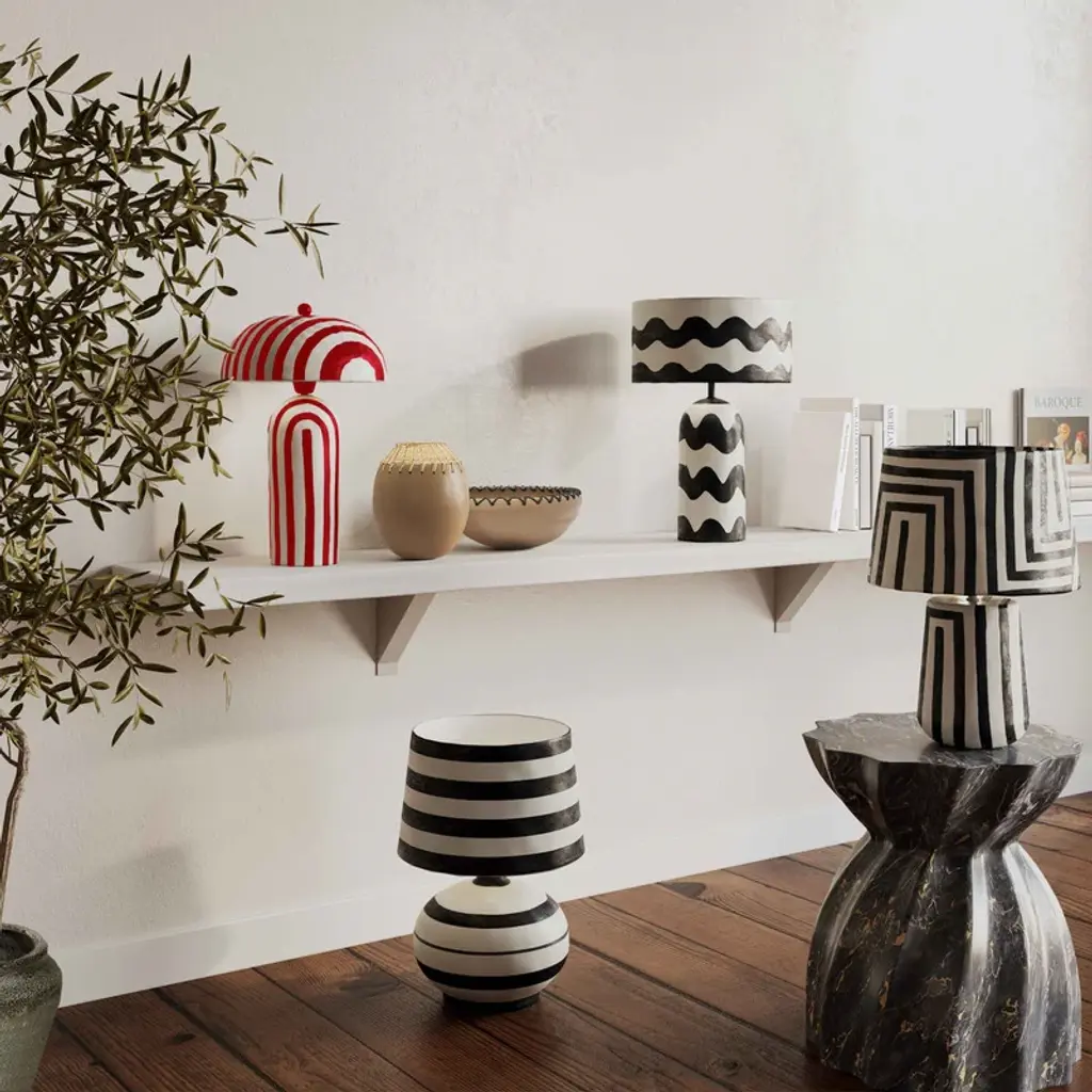 Illuminate your space with the charming Maiori Striped Papier Mache Table Lamp, featuring a beautiful, bold silhouette crafted from innovative paper mache construction. The lamp's punchy stripes add a playful touch, complemented by a domed lampshade and an adorable orb finial. Available in several color options, this lamp effortlessly adds striking personality to any space, making it a delightful and stylish accent for your home. Features: