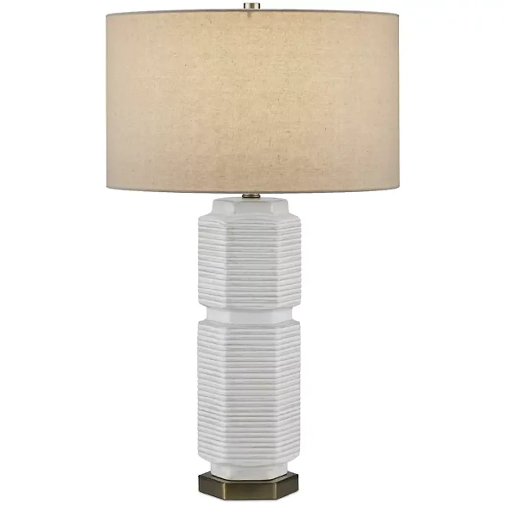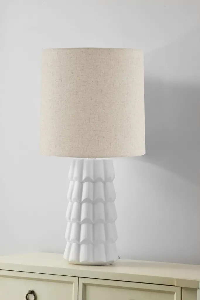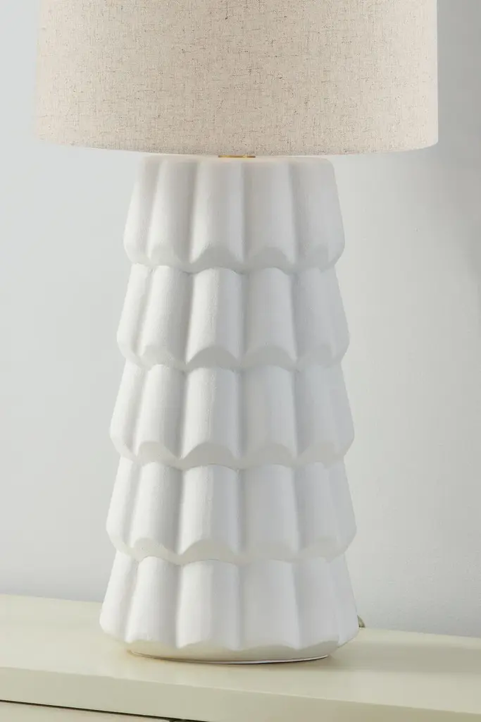The "ruffles" of this table lamp's ceramic body give it classic cottage charm. The Belgian linen shade is a refined finishing touch.