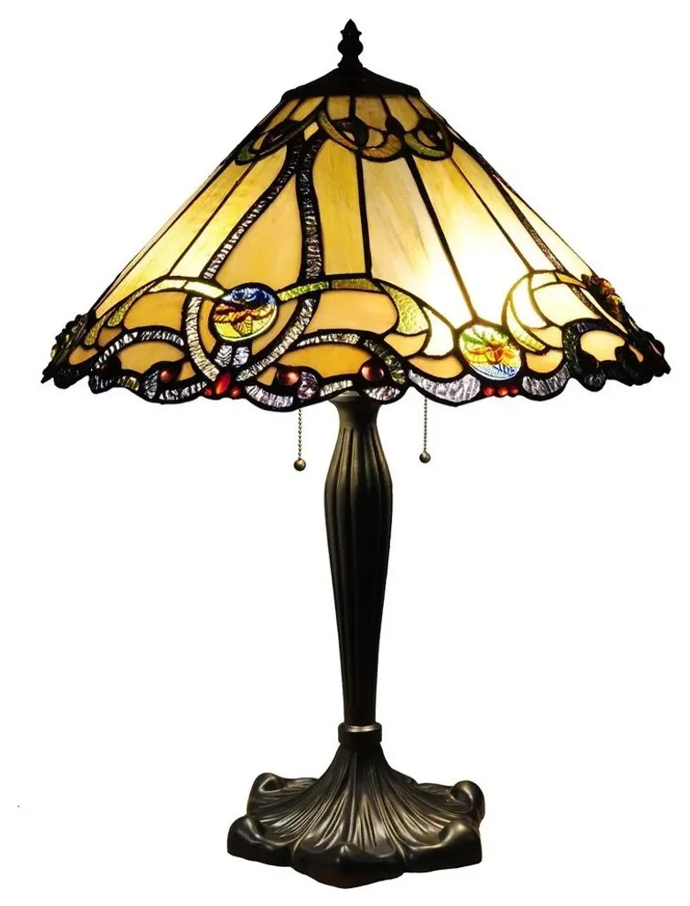 This amber Tiffany style Victorian design table lamp with a bronze finished base will be a great adds to your home.(2) 60 Watt max E26 Type A Bulb (not included)Pull chain switch328pcs glass cut, 86 beadsDownlightIndoor SettingSince these are hand crafted products, the exact color of glass pieces may vary. Colors of the glass will appear darker and less vibrant when not illuminated. Handmade glass will vary from one piece to the other; glass made at different times will also vary. Light bulbs used in lamps or ambient lighting may affect the appearance of the products. Stained glass product has been protected with mineral oil as part of the finishing process. Please use a soft dry cloth to remove any excess oil.