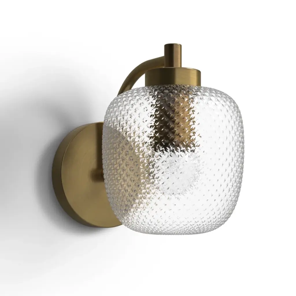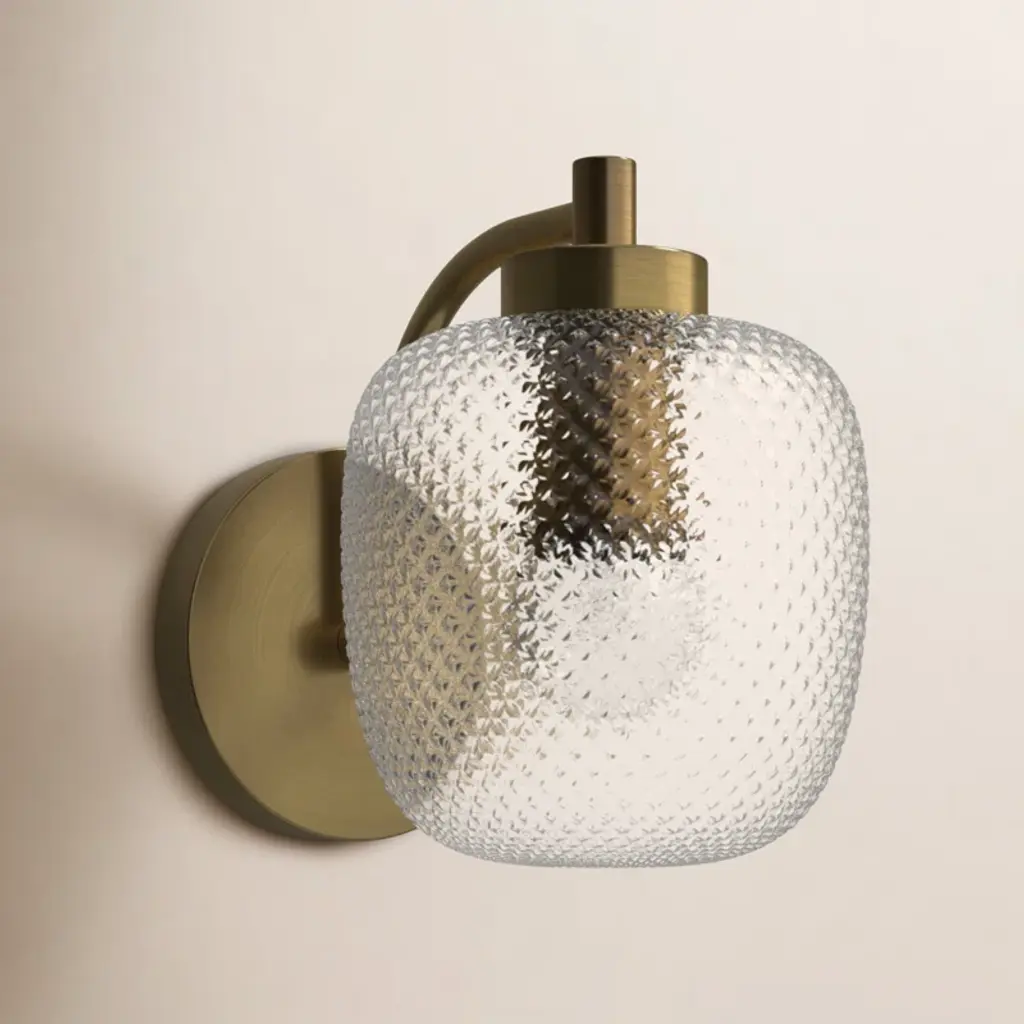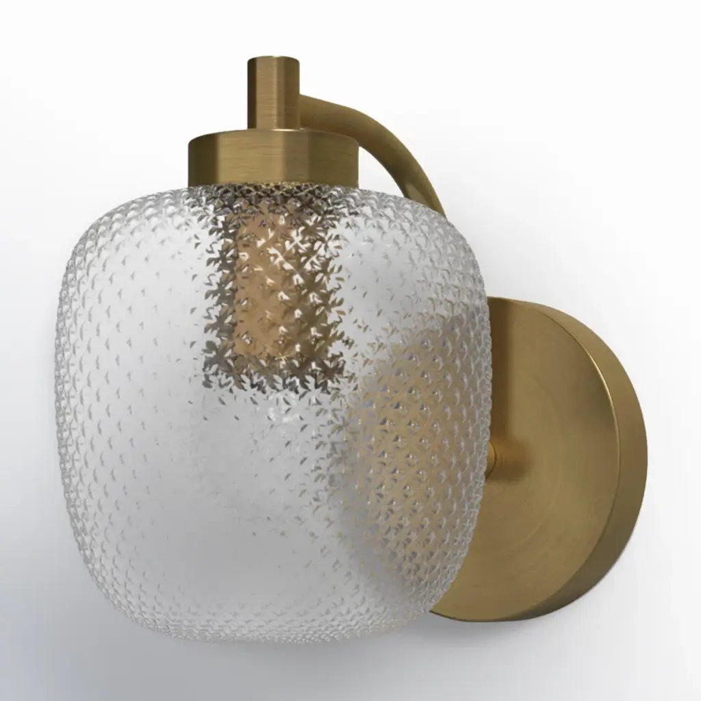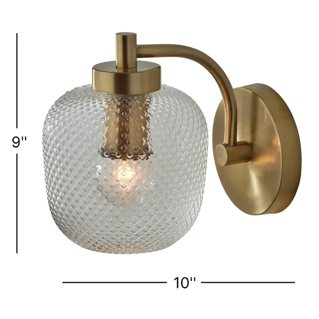 With a skillful blend of metal and textured glass, the Maldives wall lamp elevates any space with contemporary style. For symmetrical design, pair two of these sconces on either side of beds, fireplaces, or mirrors or place individually in entryways or other spaces for a pop of light. The round wall mount in antique brass finish supports a matching, gracefully arching stem. The shade is crafted of clear textured glass that brings warmth to your room by softly diffusing the light from a 60W bulb. Complete your décor with the coordinating Maldives floor lamp, table lamp, and pendant light.