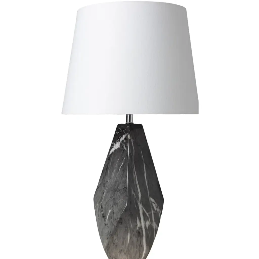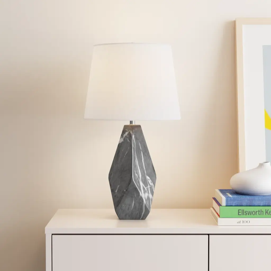 Offering a natural look with illumination, this 25'' table lamp instantly draws the eye in any ensemble. Crafted from ceramic, its base takes on a geometric silhouette and features a marble-inspired finish for a contemporary appearance perfect for industrial lofts and modern farmhouses alike. Up top, a single light is highlighted by a tapered white shade to evenly distribute a warm glow throughout your space. To clean, just wipe with a dry cloth.