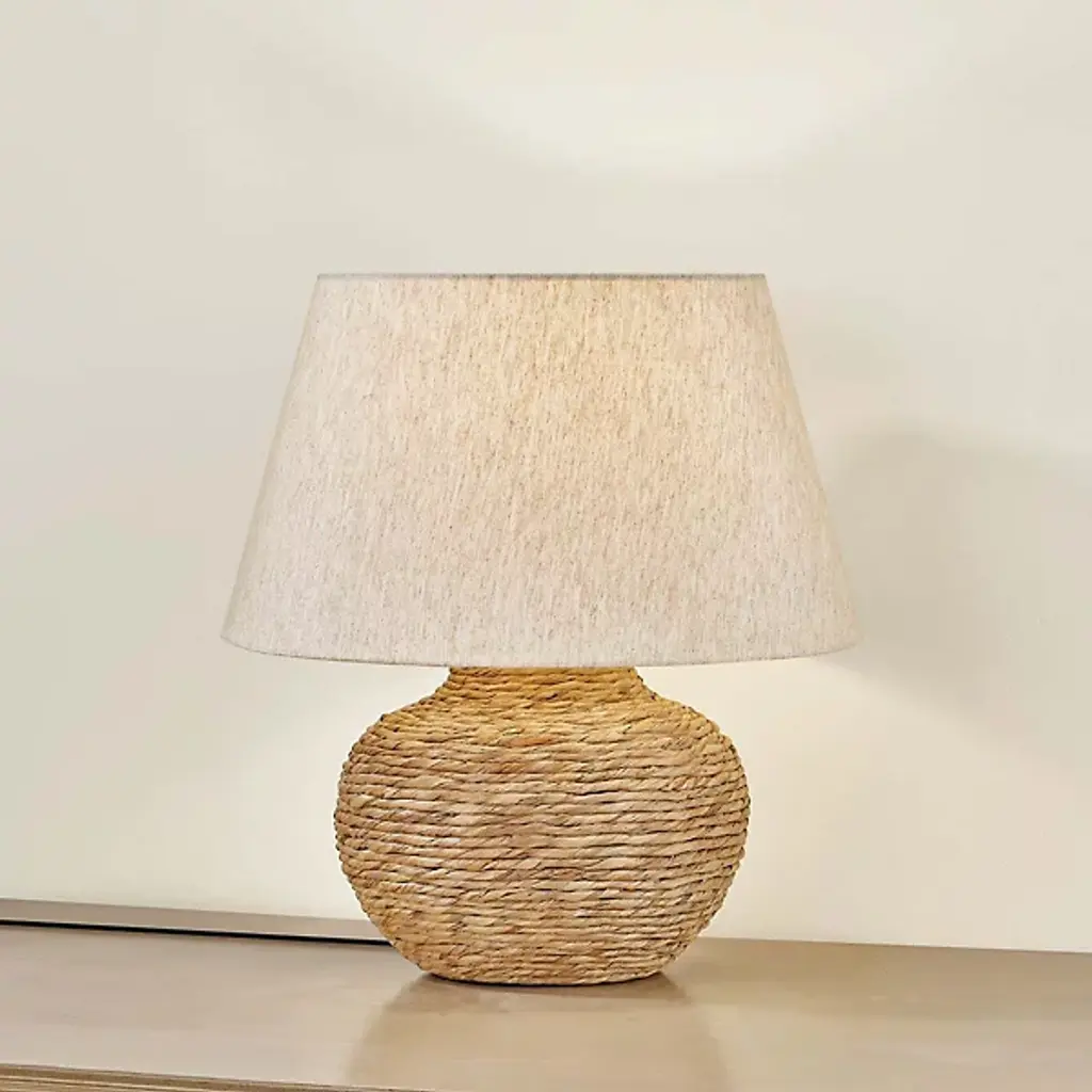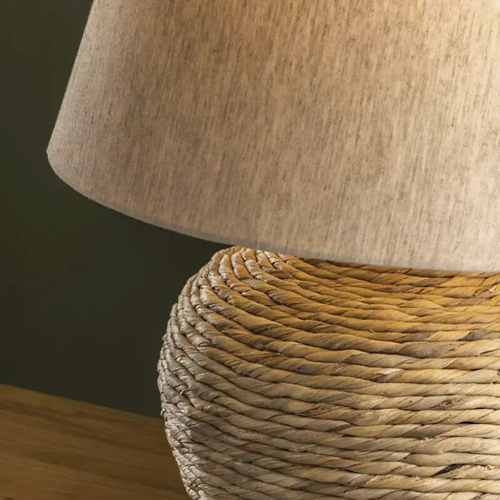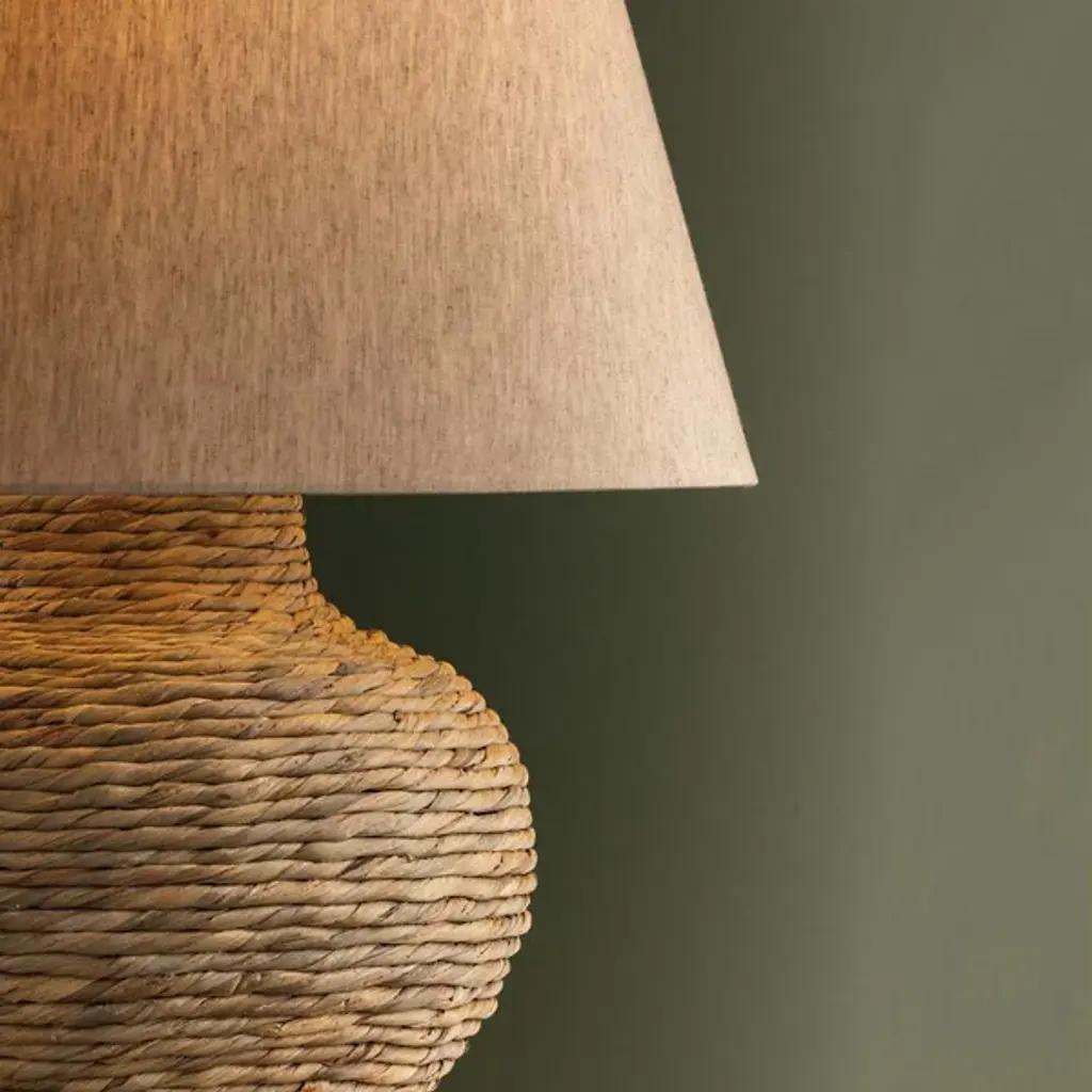 The Malik Table Lamp from Troy Lighting showcases a hand-woven water hyacinth base that swells into a voluminous, rounded form. Natural basketry techniques create the foundation's coiled texture, emphasizing the organic material's inherent variations and heathered tones. The woven construction demonstrates traditional craft methods applied to lighting design. Concealed brass hardware maintains the lamp's natural aesthetic, while the linen shade provides a complementary textile element that reinforces the fixture's emphasis on handcrafted materials and artisanal techniques.