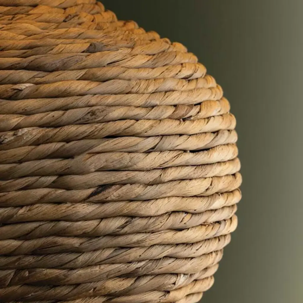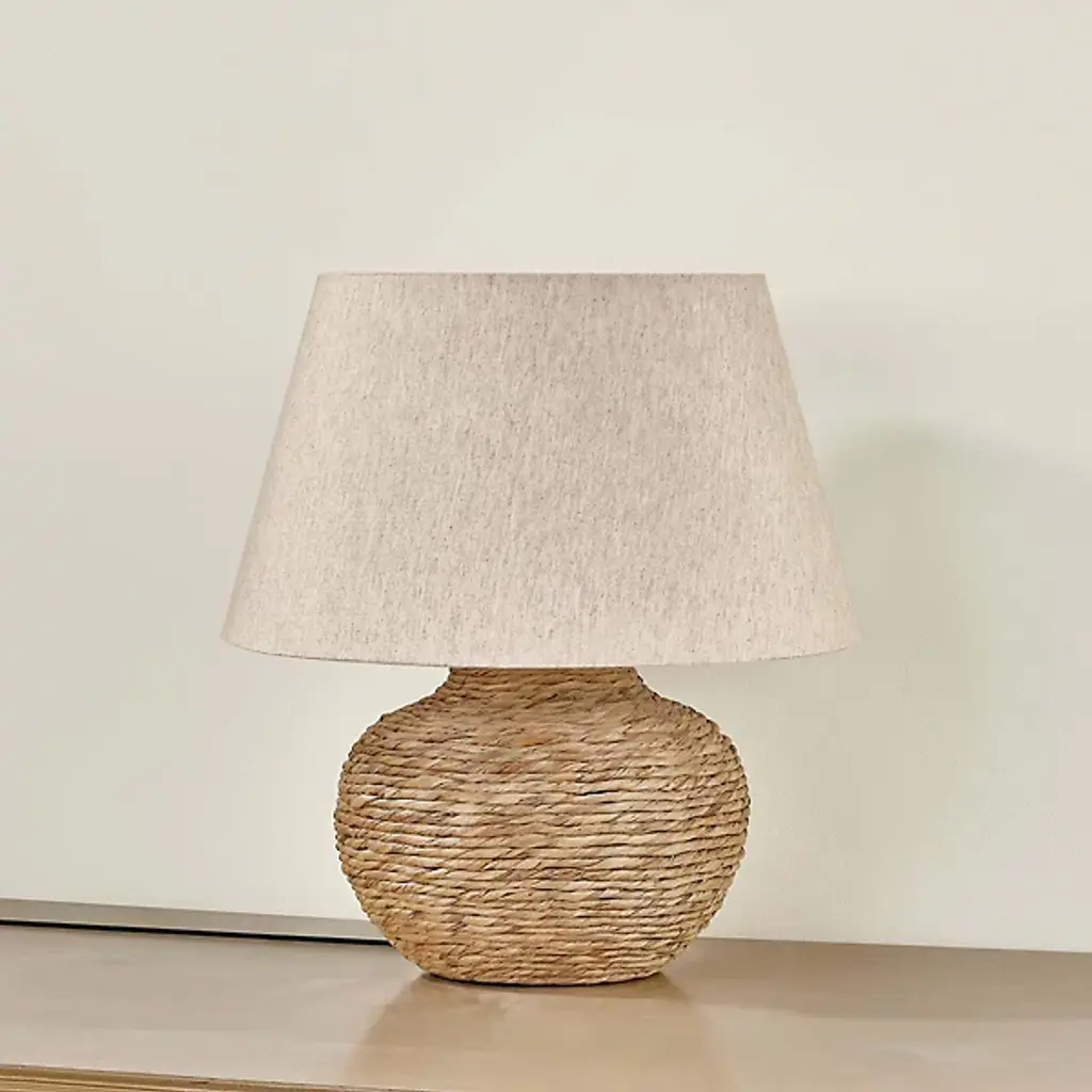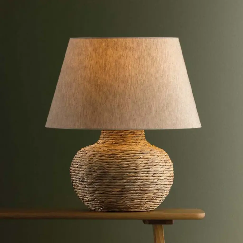 The Malik Table Lamp from Troy Lighting showcases a hand-woven water hyacinth base that swells into a voluminous, rounded form. Natural basketry techniques create the foundation's coiled texture, emphasizing the organic material's inherent variations and heathered tones. The woven construction demonstrates traditional craft methods applied to lighting design. Concealed brass hardware maintains the lamp's natural aesthetic, while the linen shade provides a complementary textile element that reinforces the fixture's emphasis on handcrafted materials and artisanal techniques.