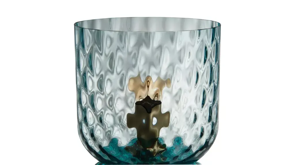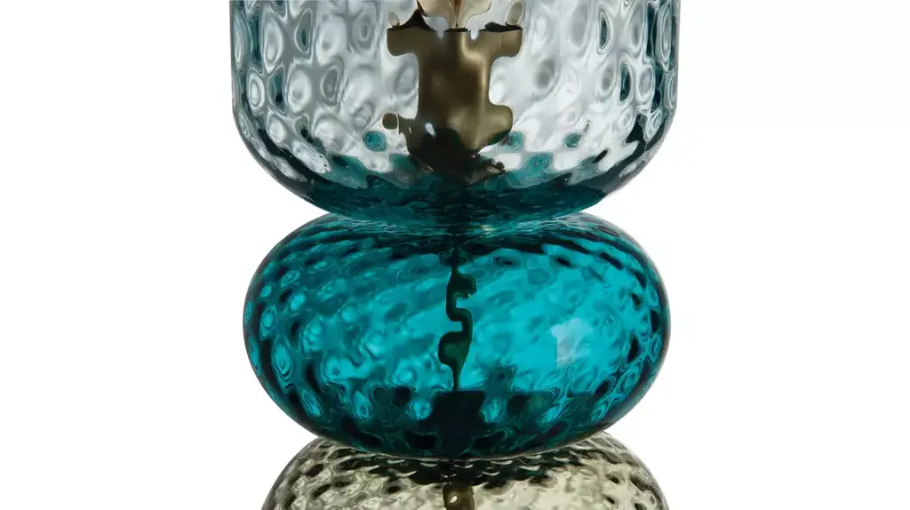La lampe Malo evoque un bijou constitue de verres textures et colores, tels des perles precieuses, savamment associes et sertis de metal dore pour une finition luxueuse. Cette lampe existe en trois dimensions et deux versions couleurs.
