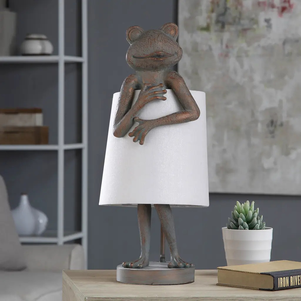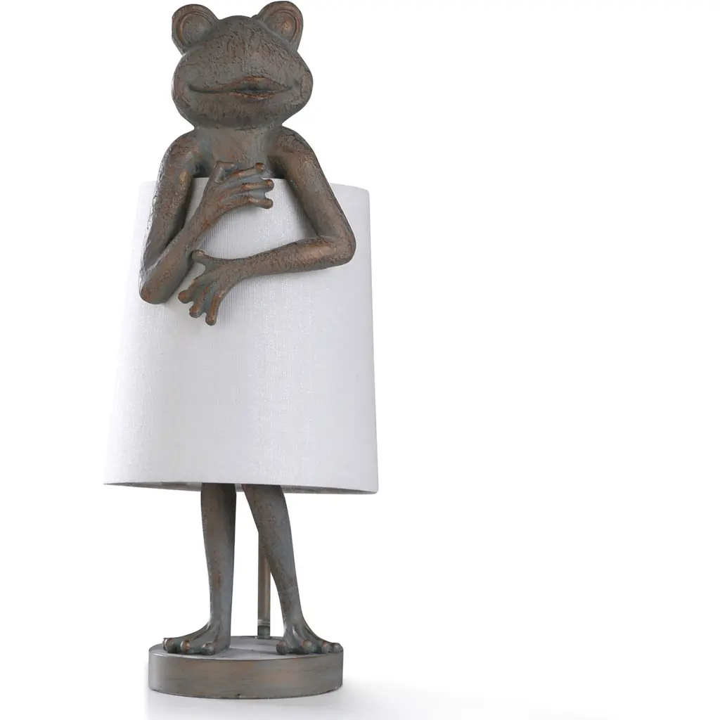 This one-of-a-kind frog-shaped base Malta table lamp is not only functional and elegant but also a surefire conversation starter that will bring any bedroom, office, living room or foyer to life. It makes for a fantastic transitional piece to bring some life to an otherwise barren hallway, and the modest standing frog figure is sure to bring on plenty of smiles while still keeping it chic.Modest Standing Frog Figure Shaded LampLine SwitchHardback shadeFrame finish: Dark Sage and Aged Copper MetalFrame material: Poly ResinShade color: WhiteShade material: LinenSwitch type: On/OffSwitch location: Neck SocketShade shape: DrumRequires one (1) 60-watt A19 E26 Incandescent base bulb(s) (not included)Portable base: 10.25 DiaCord length: 62 inchesStem length: 1 x 3"HShade dimensions: 10.25 inches high x 9.5 inches wideDimensions: 23 inches high x 9.5 inches wideDue to lighting and monitor differences, actual colors and finishes may vary slightly from what appears online.