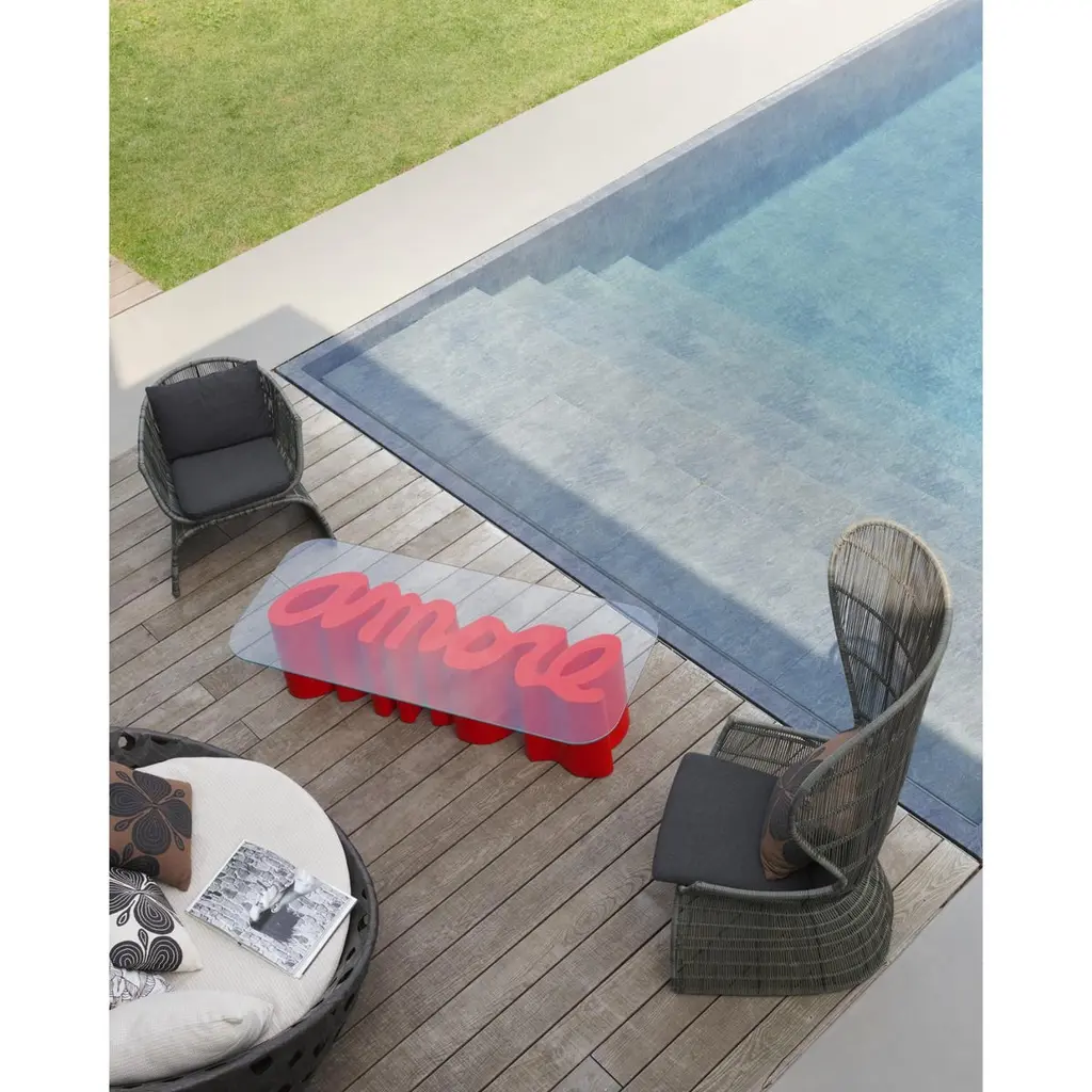 Malva Green Amore Coffee Table by Giò Colonna RomanoDimensions: D 70 x W 160 x H 46 cm.Materials: Polyethylene and tempered glass.Weight: 50 kg.Available in a standard version and lacquered version. Prices may vary. Available in different color options. This product is suitable for indoor and outdoor use. This product is stackable. Please contact us. Our stories happen in places precious to us. SLIDE was born from the desire to produce furniture and light to create the perfect atmosphere that highlights emotions.Design is inspiration, surprise, joy. It's the amazement of seeing something unique for the first time. It's creating spaces to feel good and live surrounded by beauty. It means giving a personal imprint to indoor and outdoor spaces. It means choosing your ideal element that is the perfect setting for emotions and experiences, which become indelible memories. The founder Giò Colonna Romano knows this well, combining his fervent imagination with thirty years of know-how in the processing of plastic resins, giving birth to SLIDE in 2002. The first note of amazement is the luminous furniture, which immediately became a must have in the world of events. Since 2015, his son Marco Colonna Romano has taken over the reins of the company, with the same desire to grow and innovate as his father. Thanks to a new panache and the team of young people it surrounds itself with, SLIDE becomes a beloved company for outdoor furniture: new shapes, materials and tactile textures have won the hearts and ideas of architects and interior designers around the world. SLIDE has thus created complete collections and furnishings, with new shapes, whose lines arise from collaboration with internationally renowned designers of the caliber of Alessandro Mendini, Paola Navone, Stefano Giovannoni, Fabio Novembre, Marcel Wanders, Karim Rashid, Marc Sadler, Francesco Favaretto and Marcantonio.New materials were chosen and inserted, initially soft and rigid polyurethane, and then comfortable cushions, waterproof fabrics, tactile textures ideal for completing the polyethylene furnishings with taste and class. But SLIDE does not forget its first essence, lighting: in recent years it has developed a line of much more technical lamps for large areas, essential in shape but with great visual impact. For the first time, Slide has managed to give an artisanal twist to an industrial process: to meet the increasingly high demands of living, the production creates non-replicable shades, in which every small imperfection enhances the industrial process and makes each piece unique . Because Slide's strength has always been the careful reading of the market, the creation of something that didn't exist and which then became necessary: here Slide continues its production in Buccinasco, on the outskirts of Milan, but its name and its products reach more than 130 countries around the world.
