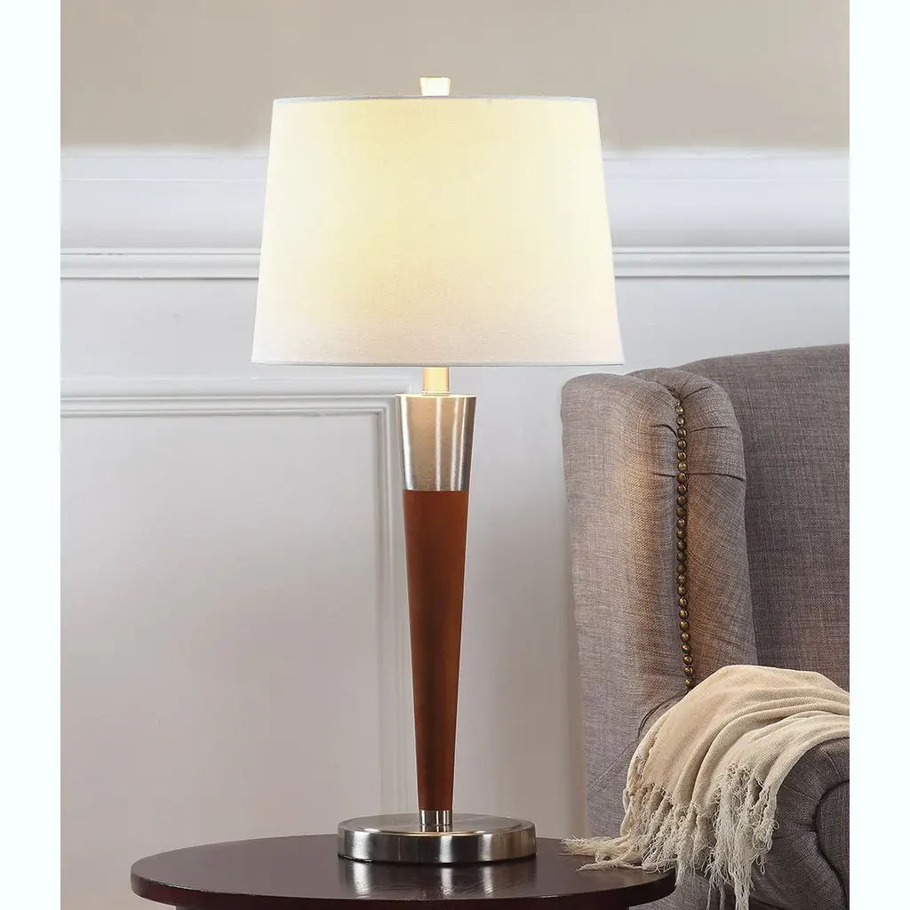 Provide additional lighting in your bedroom, living room, or study with this set of two table lamps. Walnut finished wood and nickel finished metal are combined to create a base that oozes contemporary elegance, while the fabric drum shades in white help filter out glare to offer bright yet comfortable lighting.