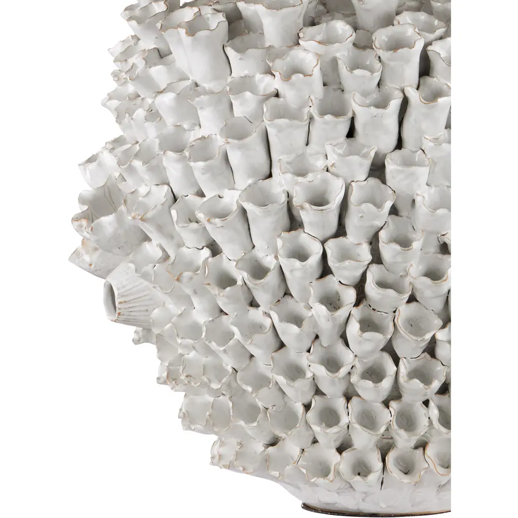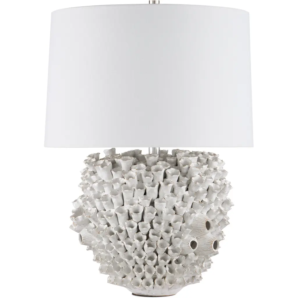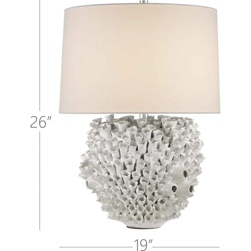 The Manitapi Table Lamp is a handcrafted ceramic piece made from dark clay that has been thrown, carved, decorated, and glazed entirely by hand. Sculpted sea-inspired elementsprimarily coral-shaped forms with occasional clusters of barnaclesare individually crafted from clay and applied to the body. Finished in white, the lamp is a unique expression of artistry and craftsmanship.