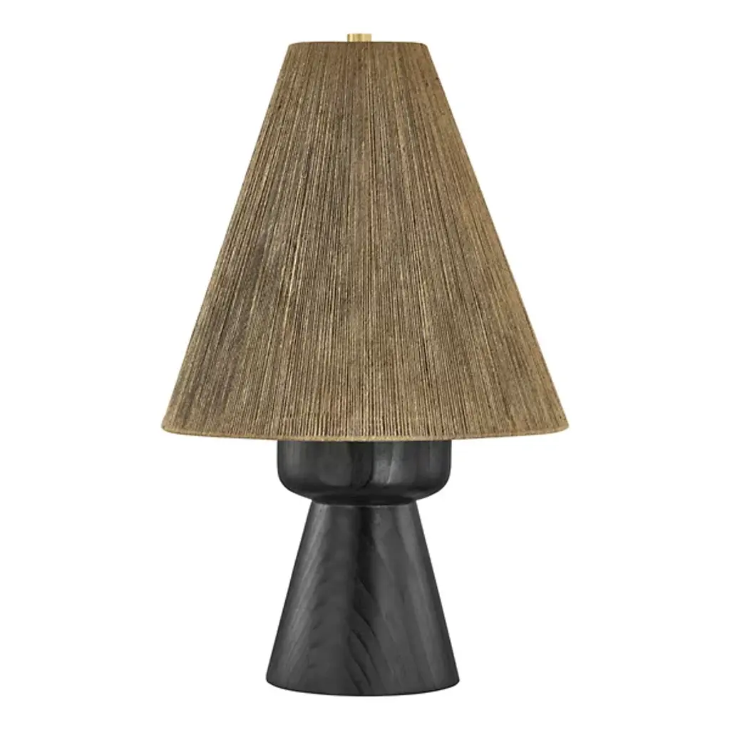 A unique approach to shading, clever play on proportions, and intriguing use of textures make the Mannsville table lamp a worthy conversation piece. Carved from Black Pine Wood, the tapered base gives the lamp a rich, organic aesthetic. This foundation contrasts beautifully with the jute string shade, creating an interplay of light and dark that is accented by an Aged Brass finish on the hardware. The oversized shade makes the base appear smaller, adding drama to desks and consoles. Due to the one-of-a-kind nature of the medium, exact colors and patterns may vary slightly from the image shown.