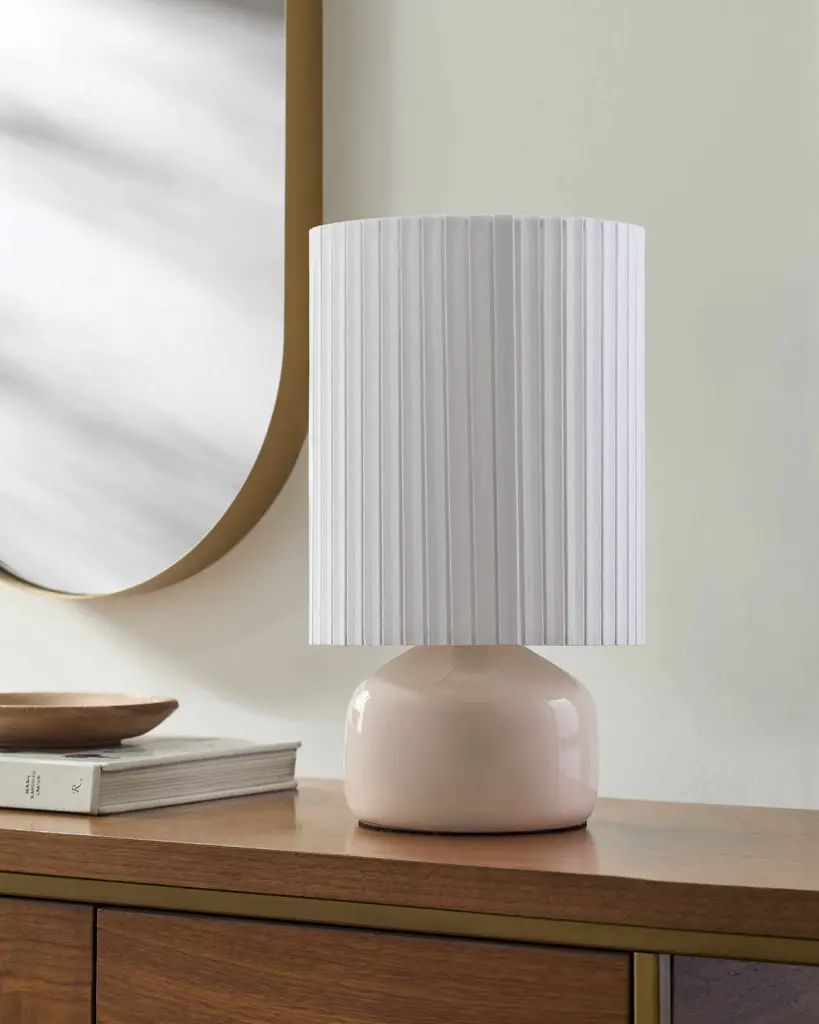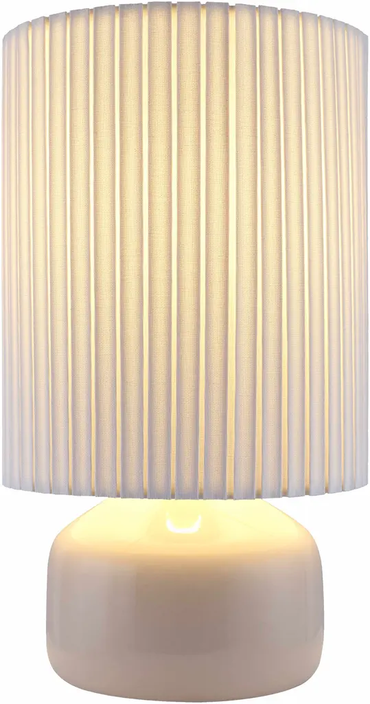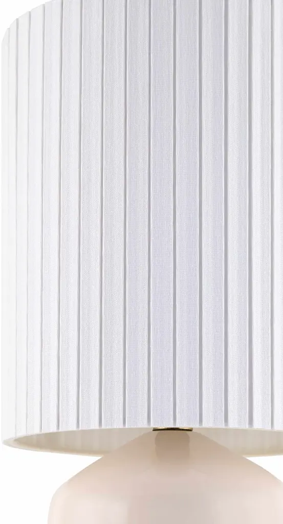 Collection: Manzaneda Colors: Pink, Cream, White, Translucent Material: Body: Ceramic / Shade (Outside): Linen Styles: Traditional Made In: China Lighting Type: Accent Table Lighting Shade Material: Linen Shade Color: White, Cream Cord Length: 6' Switch Type: On/Off Number of Bulbs: 1 Socket Type: E-26 Bulb Wattage: 40W