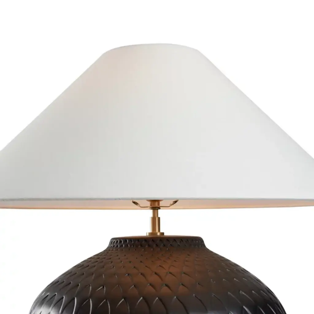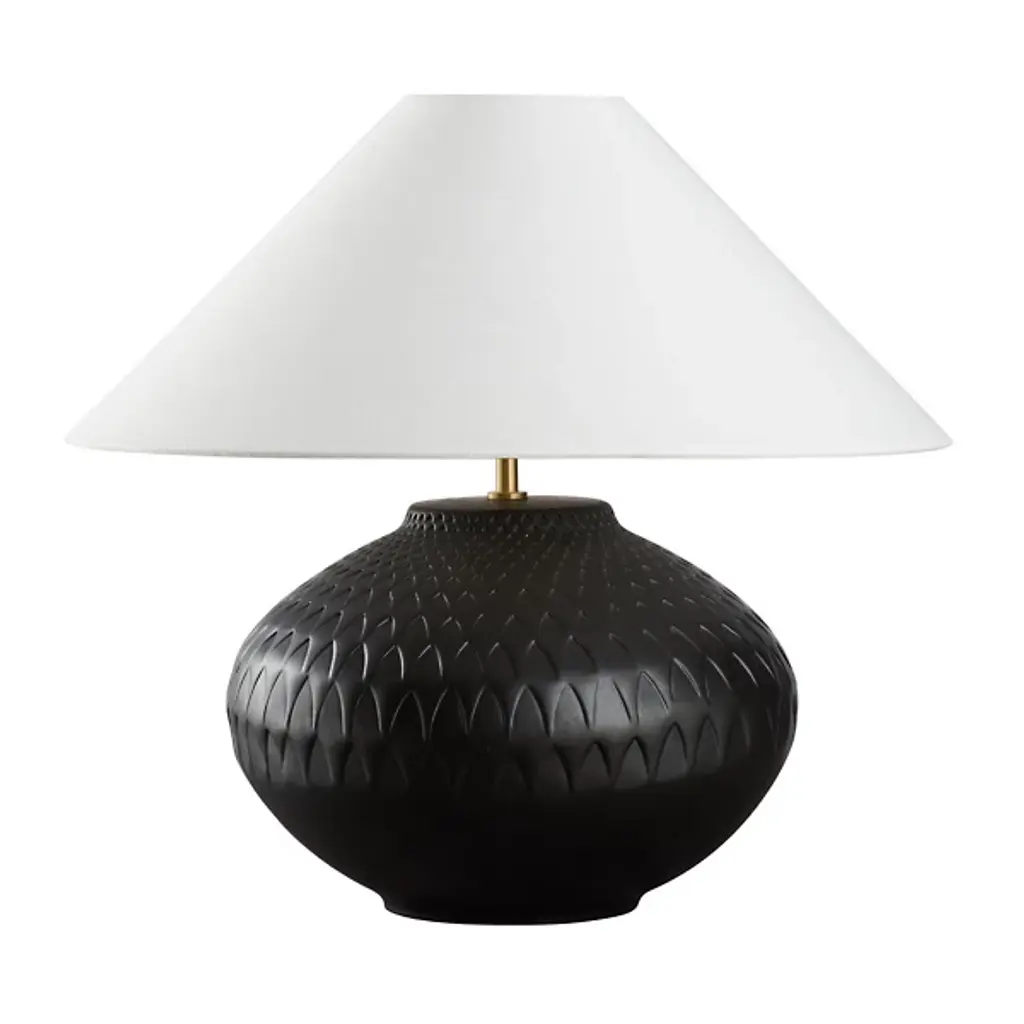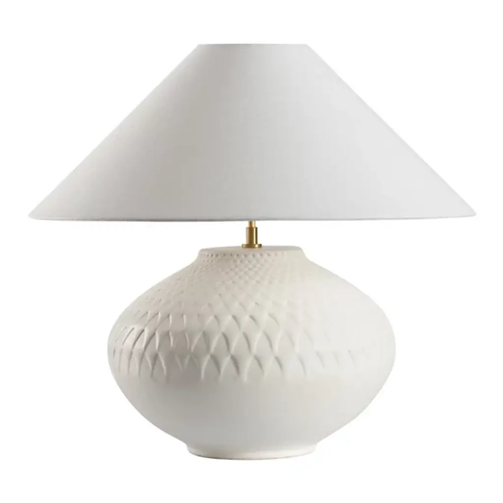 The Manzoni Table Lamp from Wildwood features an intricate carved surface pattern that wraps around its low, rounded ceramic base. Hand-crafted in Italy, this piece brings sculptural presence through its dimensional texture work that creates interesting shadows and highlights as light moves across the surface throughout the day. The geometric detailing adds artistic complexity while maintaining practical function. Its grounded profile makes it ideal for console tables, nightstands, or desk surfaces. The linen shade complements the textured base perfectly, creating a cohesive design that works in both traditional and modern settings.
