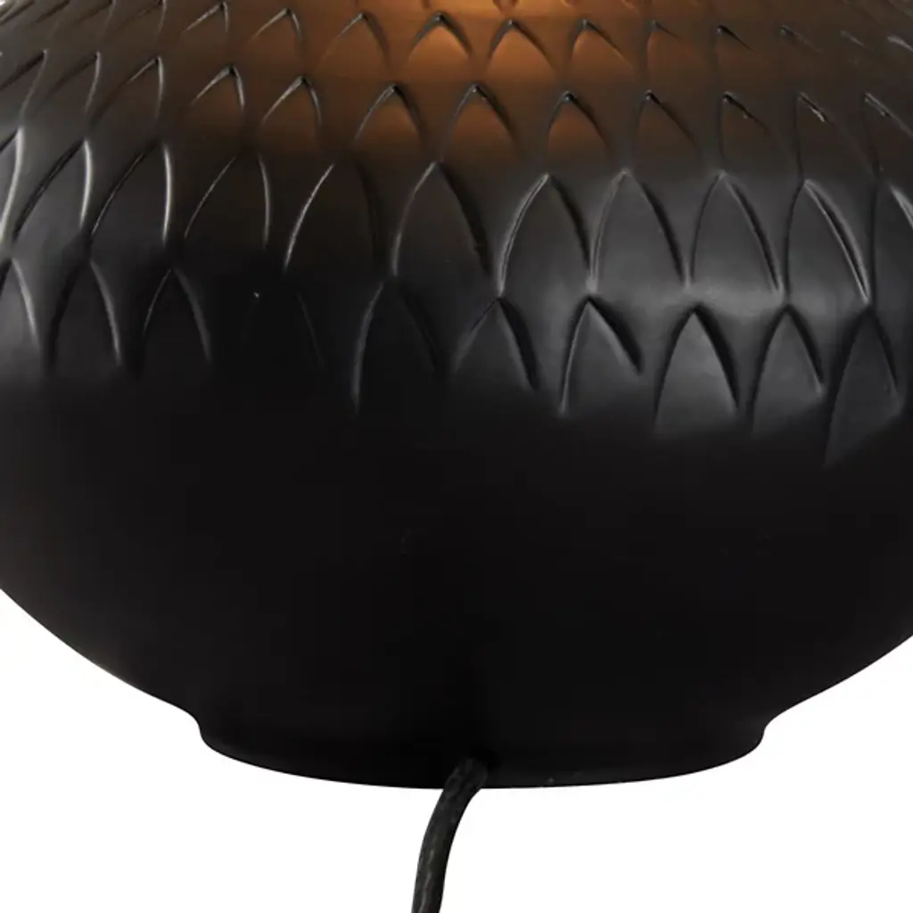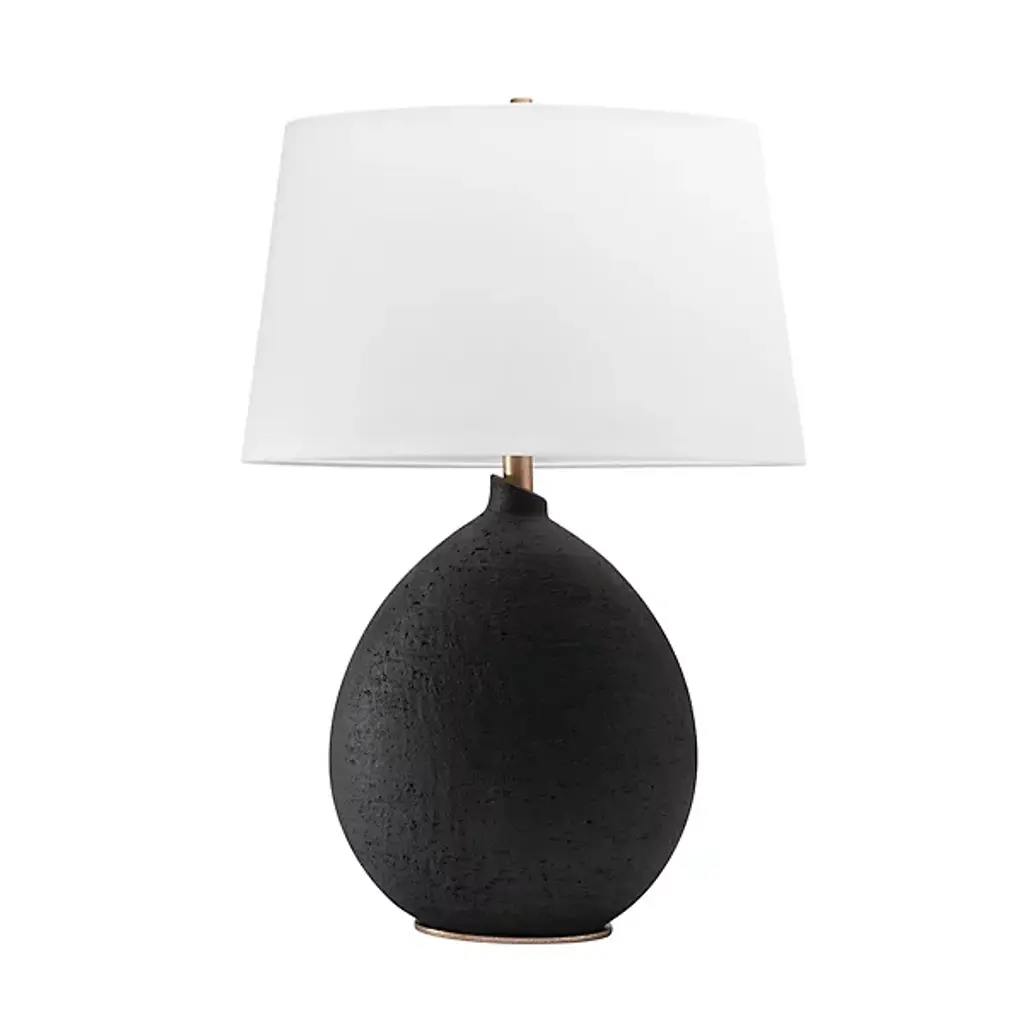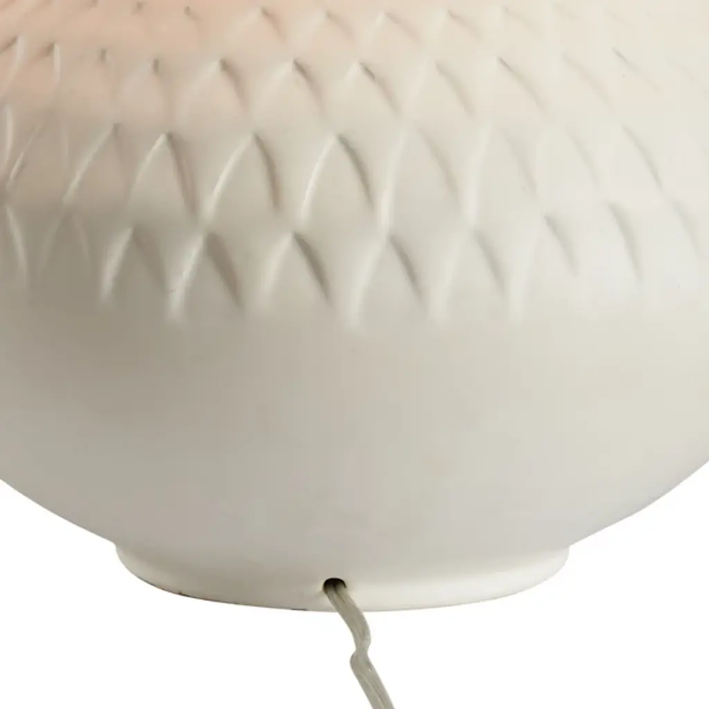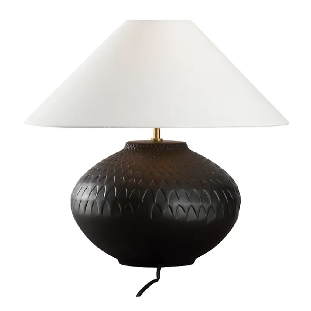 The Manzoni Table Lamp from Wildwood features an intricate carved surface pattern that wraps around its low, rounded ceramic base. Hand-crafted in Italy, this piece brings sculptural presence through its dimensional texture work that creates interesting shadows and highlights as light moves across the surface throughout the day. The geometric detailing adds artistic complexity while maintaining practical function. Its grounded profile makes it ideal for console tables, nightstands, or desk surfaces. The linen shade complements the textured base perfectly, creating a cohesive design that works in both traditional and modern settings.