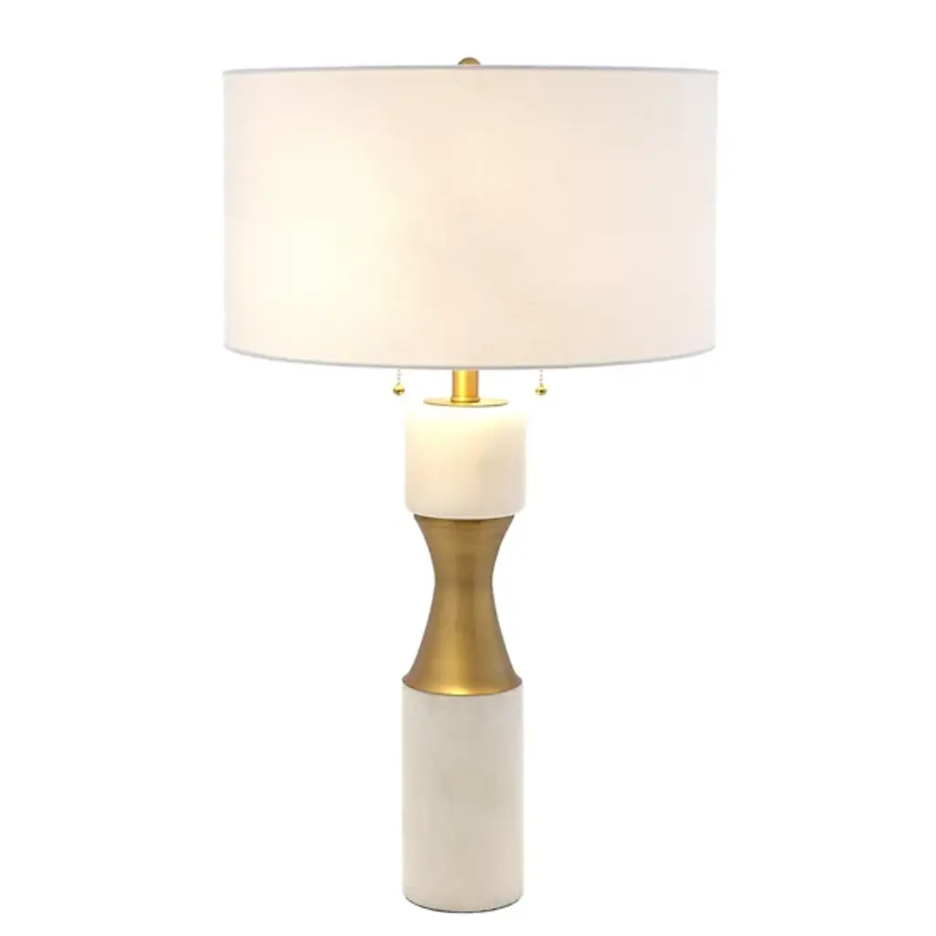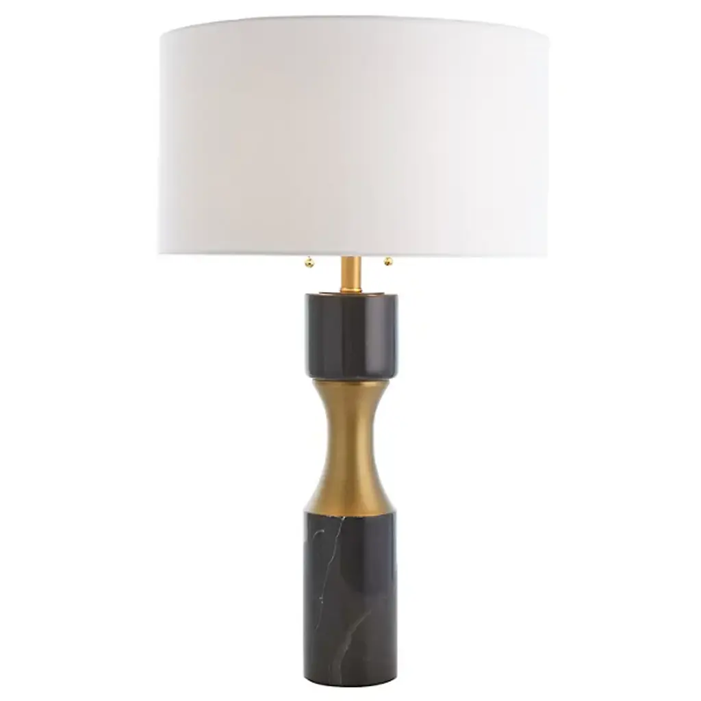 Like an elegant corset in silhouette. Present your room with the beautiful glow and figure of the Marble Cinch Table Lamp from Global Views. It’s a sophisticated piece with a clean, modern aesthetic. The eyes are drawn to the rich, classic texture of the two marble forms. A steel form in between them gives the piece a tapered waist that stands out from afar. The bold hue of the metal seduces against the milky marble. A white linen drum shade adds a classic touch to the piece. Two metal pull chains peek out the bottom of the shade like beautiful earrings. Tug on each one and receive your fill of warm ambient lighting.