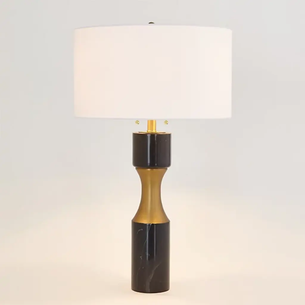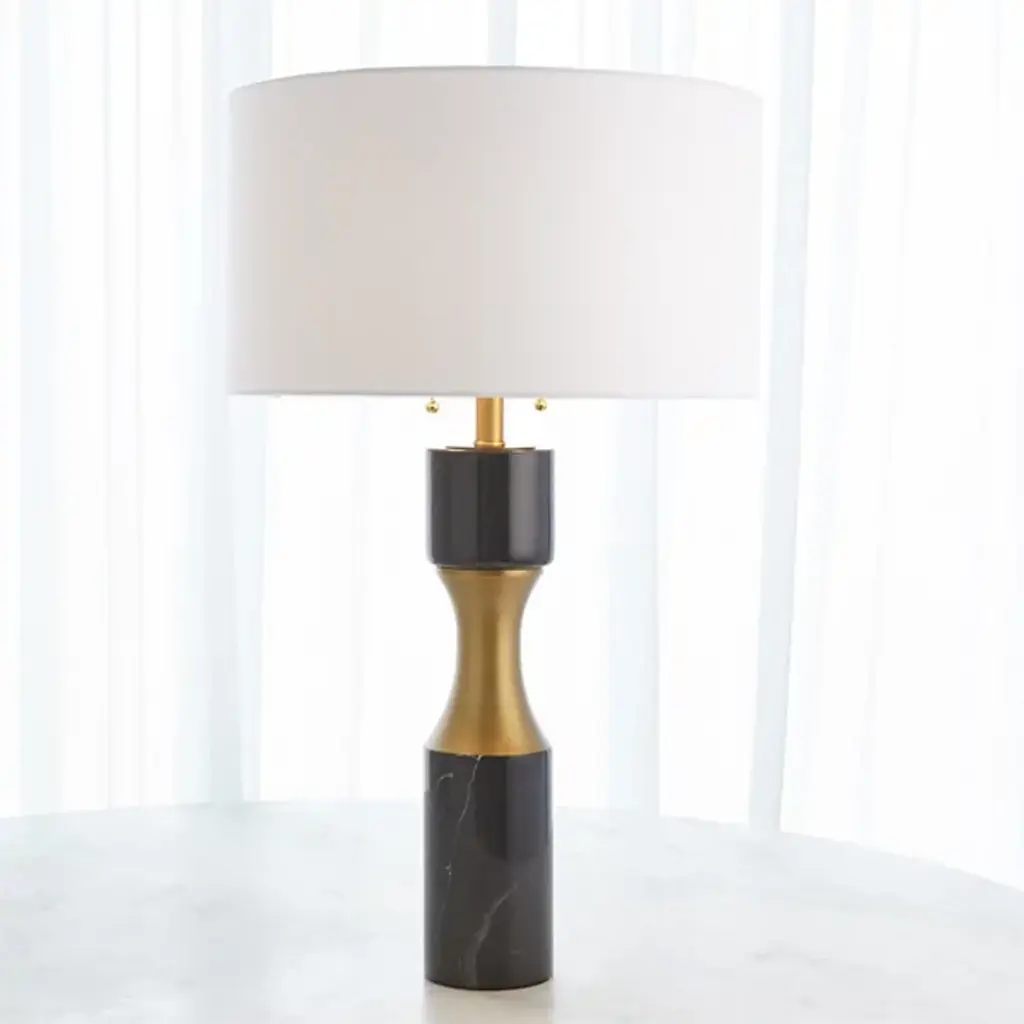 Like an elegant corset in silhouette. Present your room with the beautiful glow and figure of the Marble Cinch Table Lamp from Global Views. It’s a sophisticated piece with a clean, modern aesthetic. The eyes are drawn to the rich, classic texture of the two marble forms. A steel form in between them gives the piece a tapered waist that stands out from afar. The bold hue of the metal seduces against the milky marble. A white linen drum shade adds a classic touch to the piece. Two metal pull chains peek out the bottom of the shade like beautiful earrings. Tug on each one and receive your fill of warm ambient lighting.