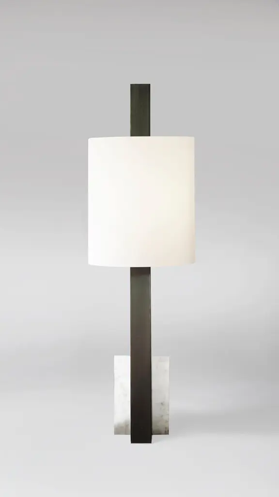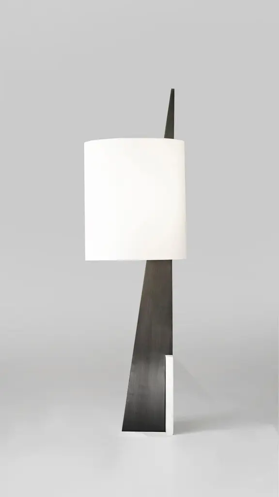 Marble Cut Triangle I Table Lamp by Square in CircleDimensions: 30 diameter x 102 height cmMaterials: Brushed brass finish, white frosted glass, dark grey metal Inspired by the El Lissitzky poster beat the whites with red wedge, this oversized triangular wedge table lamp projects through the cotton drum shade. A rectangular marble panel at the base adds extra support. Crafted from brushed grey metal and white marble with a cotton shade.Square in circle is a London-based design studio founded in 2019. The studio explores lighting design in minimal, geometric forms inspired by the Modernist Era. Materials such as marble, metal and glass combine to make each sculptural piece a 'total and complete work of art', as in the manner of Gesamtkunstwerk.All our lamps can be wired according to each country. If sold to the USA it will be wired for the USA for instance.