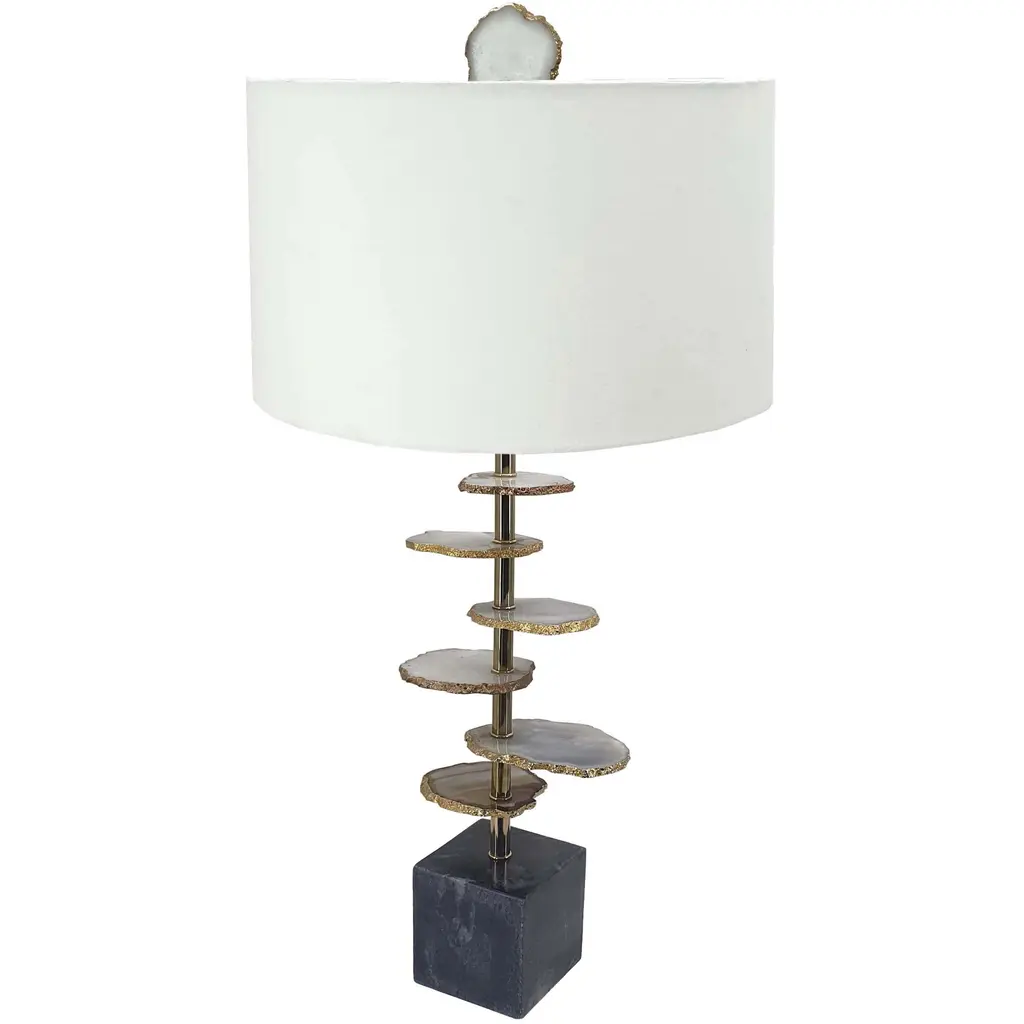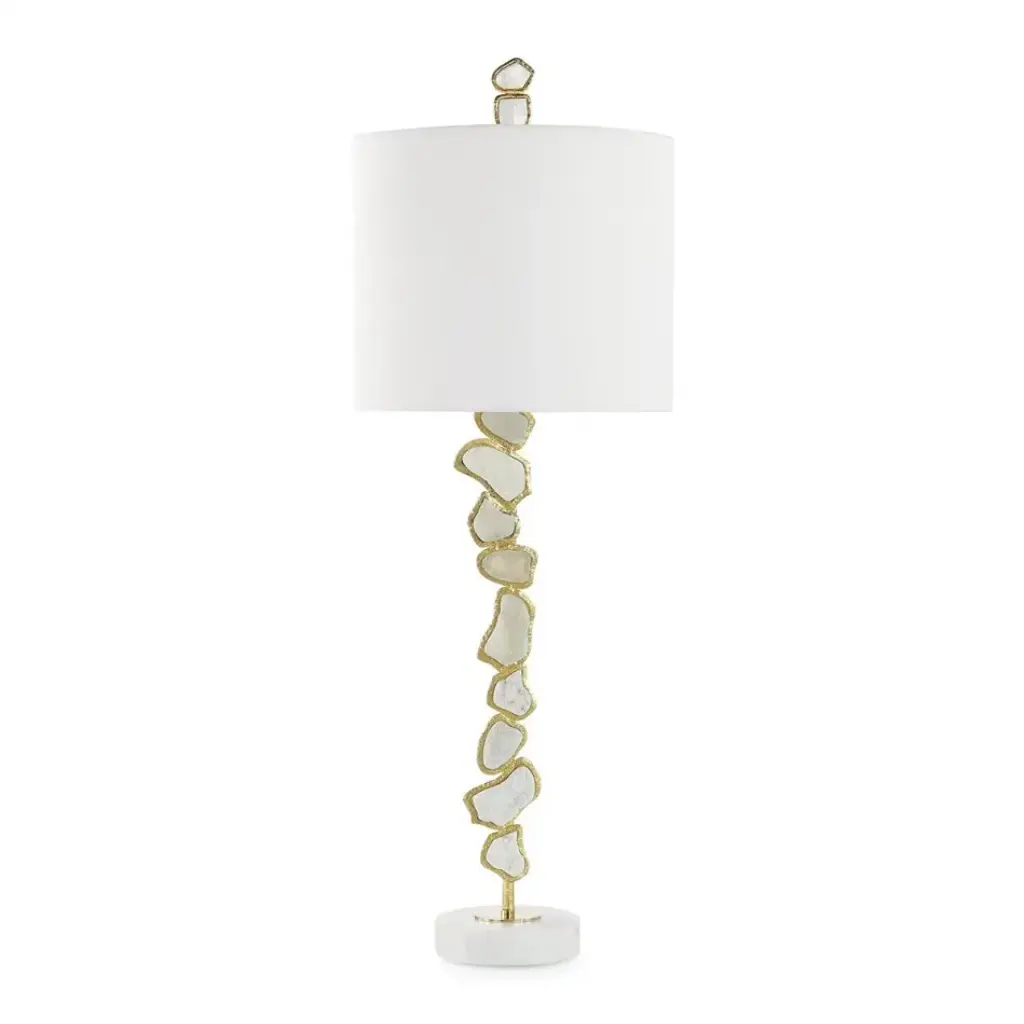 The Marble Fragments Buffet Lamp is an elegant natural motif elevated through ornate tones. A body crafted from a stack of natural white marble displays gorgeous accents in Polished Brass, perfectly outlining the organic stone. The piece rests atop a circular drusy base with a subtle glimmer. An ornate finial matches the body, completing the look is this stylish lamp.