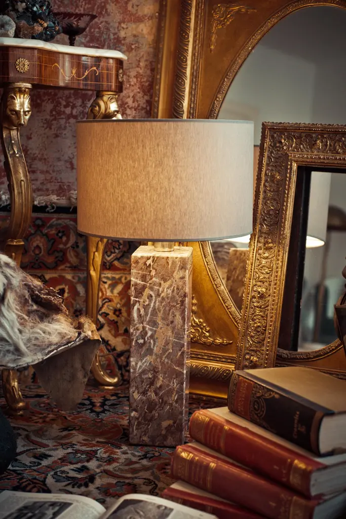 Marble sculpted table lamp by Brajak VitbergPOMPEII 1.2.Materials: Lesno brdo, polished brasswhite or black cotton lampshade, cotton wiringDimensions: 62 x 35 x 35 cmBijelic and Brajak are two architects from Ljubljana, Slovenia.They are striving to design craft elements and make them timeless through experimental designing process.The studio creates a range of products from handmade and limited small series to one piece unique products, inspired by materials and forms that create incomplete perfection.All our lamps can be wired according to each country. If sold to the USA it will be wired for the USA for instance.