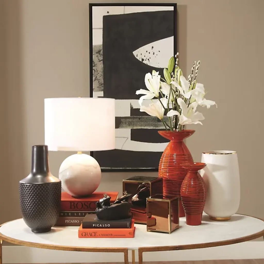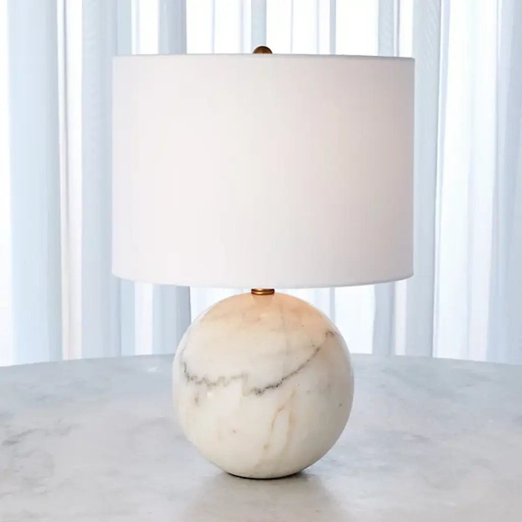 Graceful from top to bottom. The Marble Sphere Table Lamp from Global Views offers your room a simple yet entrancing visual. Clean, modern shapes stamp this piece as a refined one. The spherical body pleases in its gentle curves. The marble body invites a closer inspection as beautiful veining scatters across its surface. Rich organic colors shift across the marble body like an abstract painting. An elegant fabric shade hides the light source for eye comfort and drama. The inviting ambient light coming from the shade accentuates the remarkable features of the marble surface.