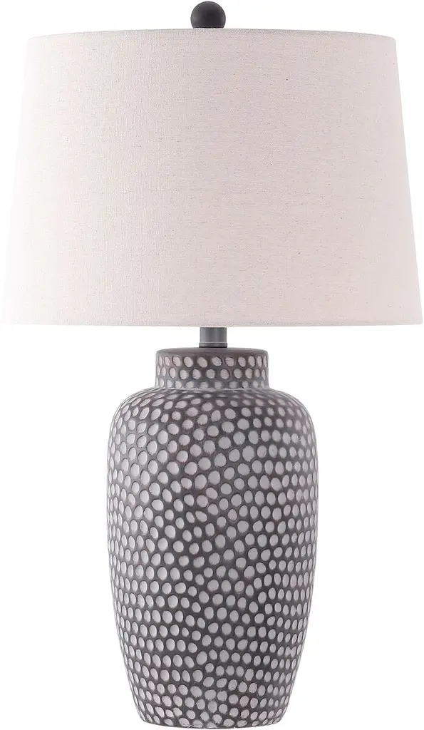 Illuminate your space with the exquisite Marcella Table Lamp, a masterpiece of design and craftsmanship. This ceramic table lamp boasts a distinctively textured surface, artfully combining rustic charm with modern elegance. The lamp's surface is meticulously crafted, featuring a unique blend of brushed and crackled finishes that add depth and character to any room. Complemented by sleek brushed nickel plated iron accents, this lamp exudes sophistication. Topping off this elegant piece is a hardback drum shade made from white linen fabric, subtly textured with light slubbing, offering a soft, inviting glow. The Marcella Table Lamp is not just a source of light, but a statement piece that enhances the ambiance of your home.
