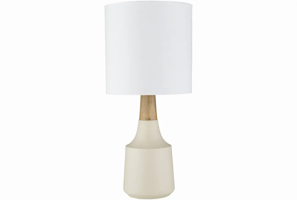 Inspired by traditional pottery, this stylish table lamp resembles an antique vase fitted with a wooden neck and linen shade. With its angular curves and textural finish, this lamp offers an eye-catching addition to transitional or modern decor.