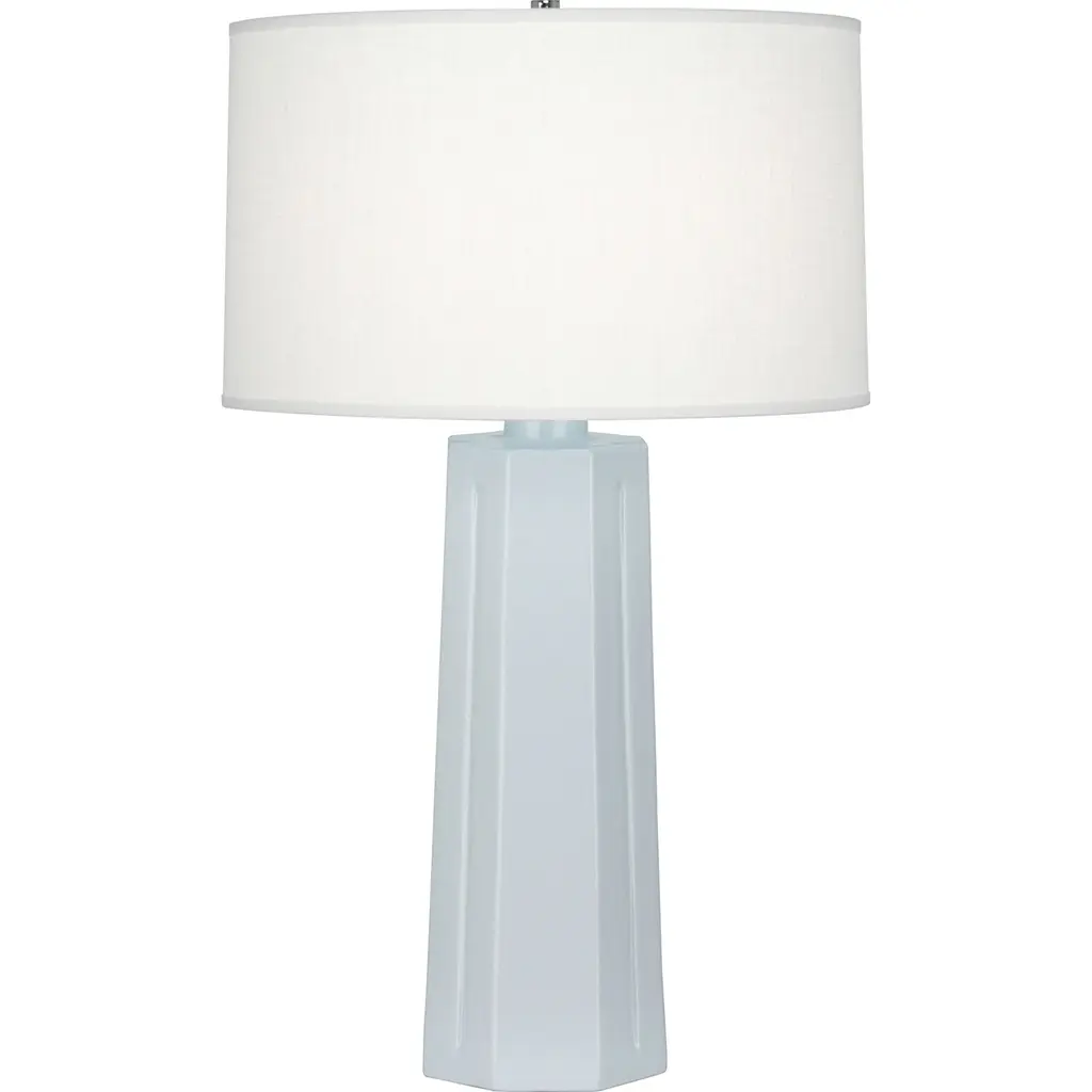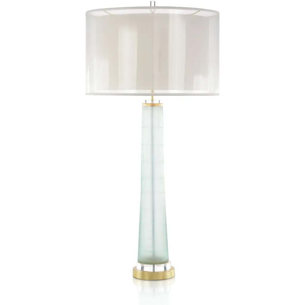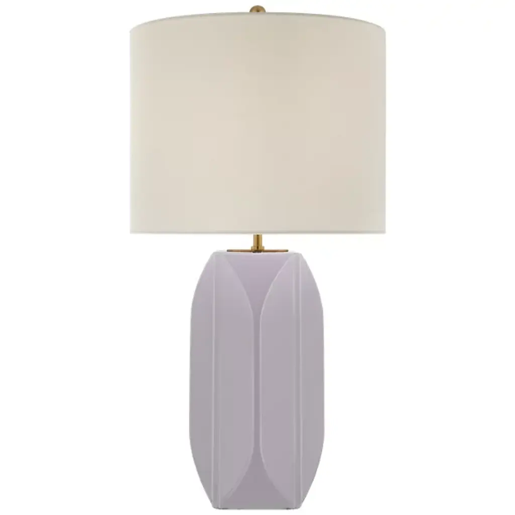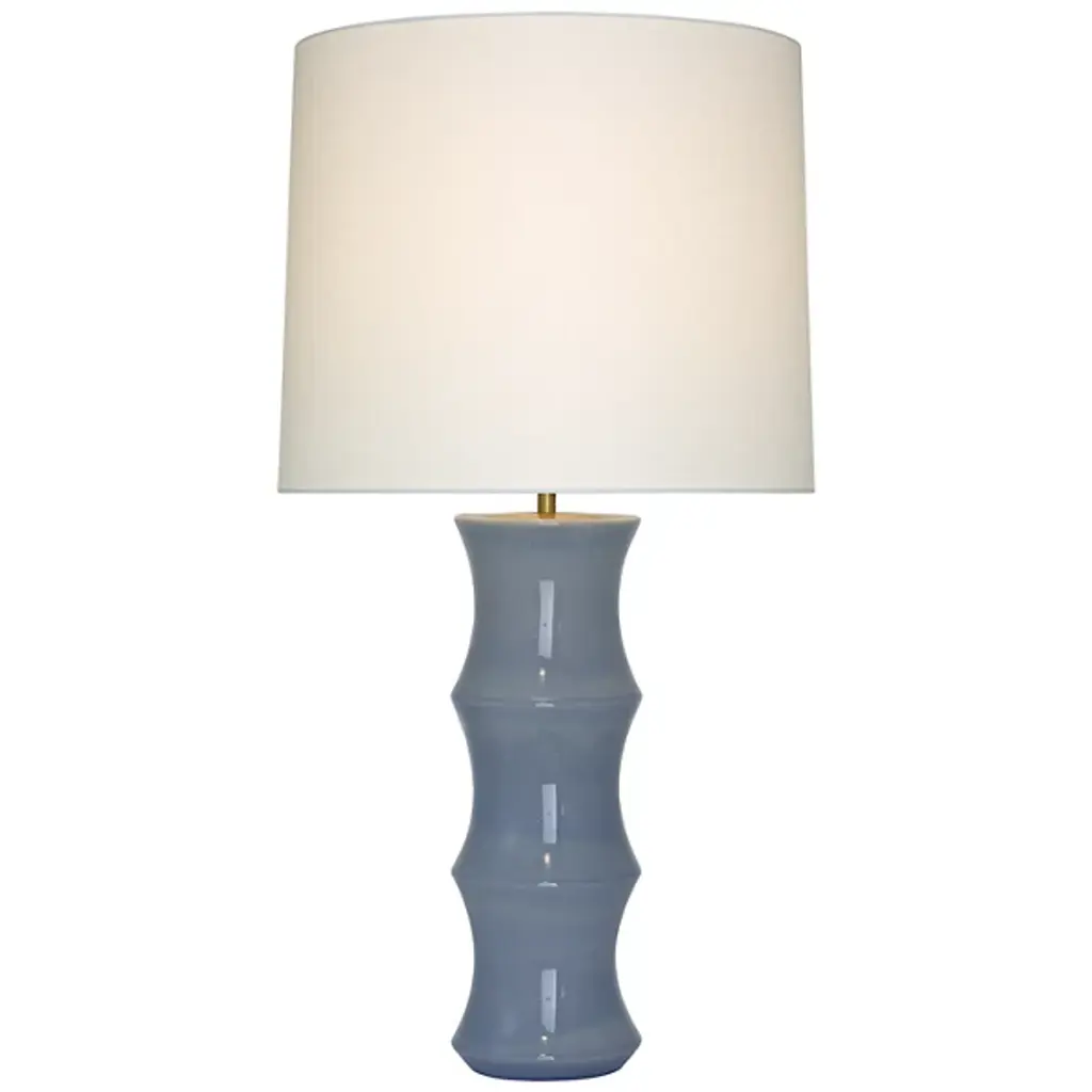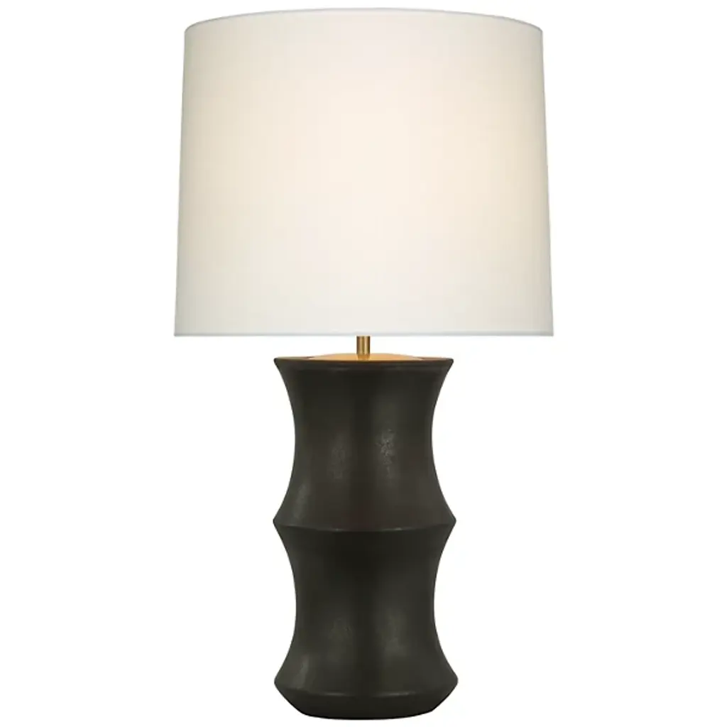 A simple structure with an enduring sculptural character that is ideal for a side table statement or illuminating a confined corner. The Marella Table Lamp from Visual Comfort Signature, formerly known as Visual Comfort, delights with a smooth, stylized body, seating inward-curving statements that offer the stylized suggestion of bamboo incorporated into a larger pattern. This intriguing body supports a single metal stem that springs from its upper surface, placing potent lamping beneath a tall drum shade of translucent linen that transmits a generous glow out around it.