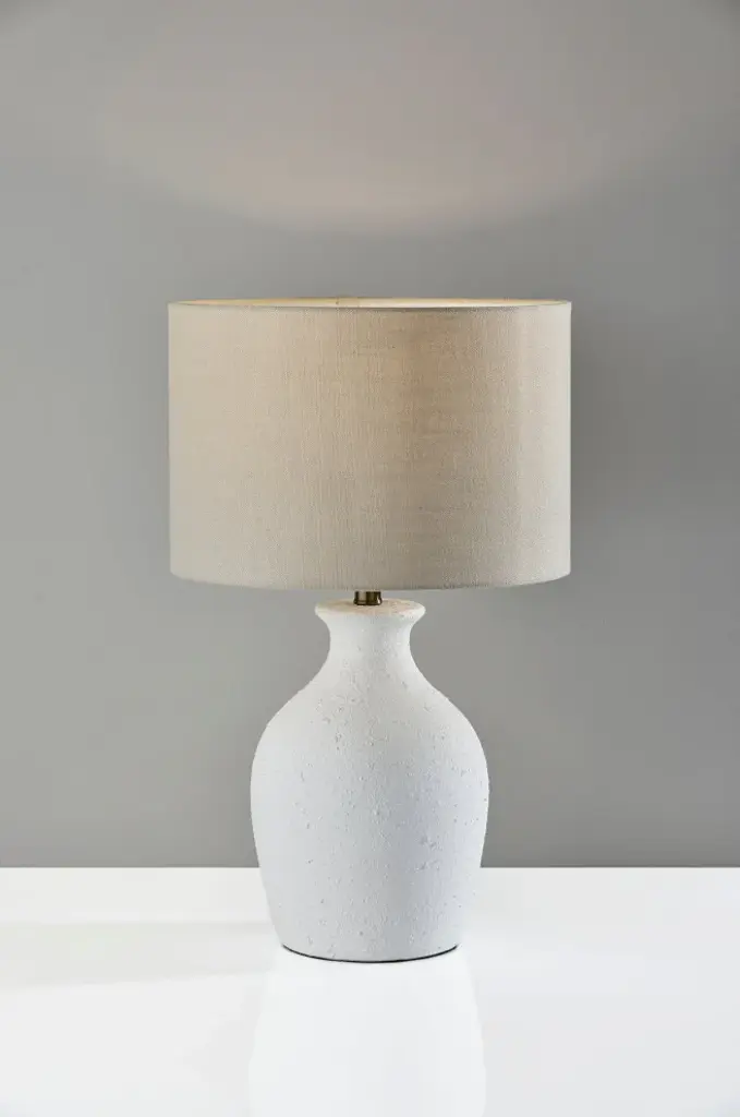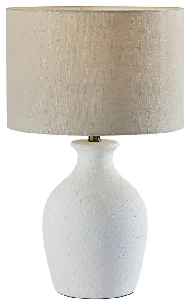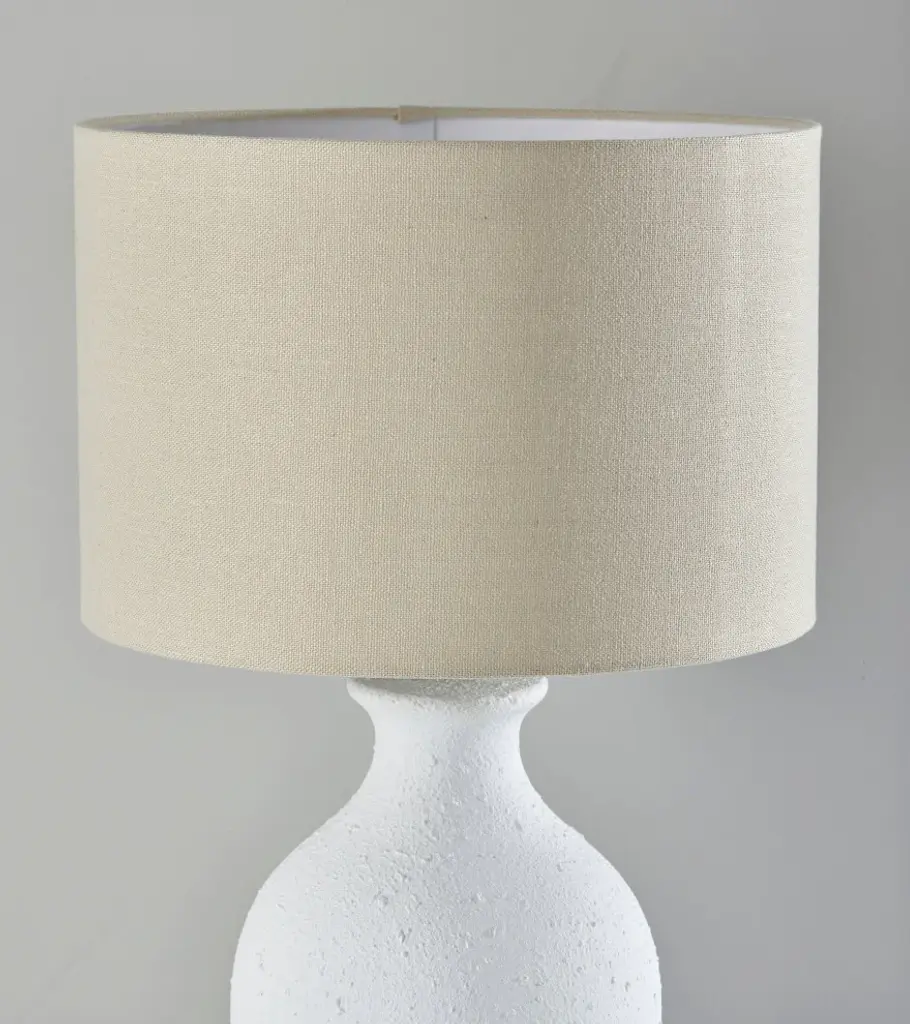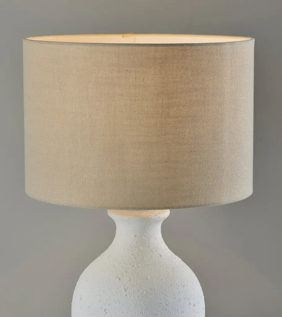 Drawing on farmhouse and coastal stylings, the Margot table lamp brings softened warmth to living rooms, bedrooms, and offices. The white jug-shaped ceramic base features thick texturing and is perfectly offset by a 15" diameter and 10" tall light beige fabric drum shade. When the 100W bulb is lit, it highlights the texturing of the fabric shade for a soft, warm look. For a contemporary, contrasting style, the Margot table lamp is also available with a black ceramic base and light brown fabric shade.At 25" tall and 15" deep, the lamp is perfectly sized for desks, nightstands, or accent tables.Ceramic texturing on the monochrome base creates visual interest.The textured fabric shade throws a soft, warm light.Easily turn the lamp on or off with a rotary socket switch.Also available with a black ceramic base and light brown fabric shade.100W Type A Bulb (Not Included)