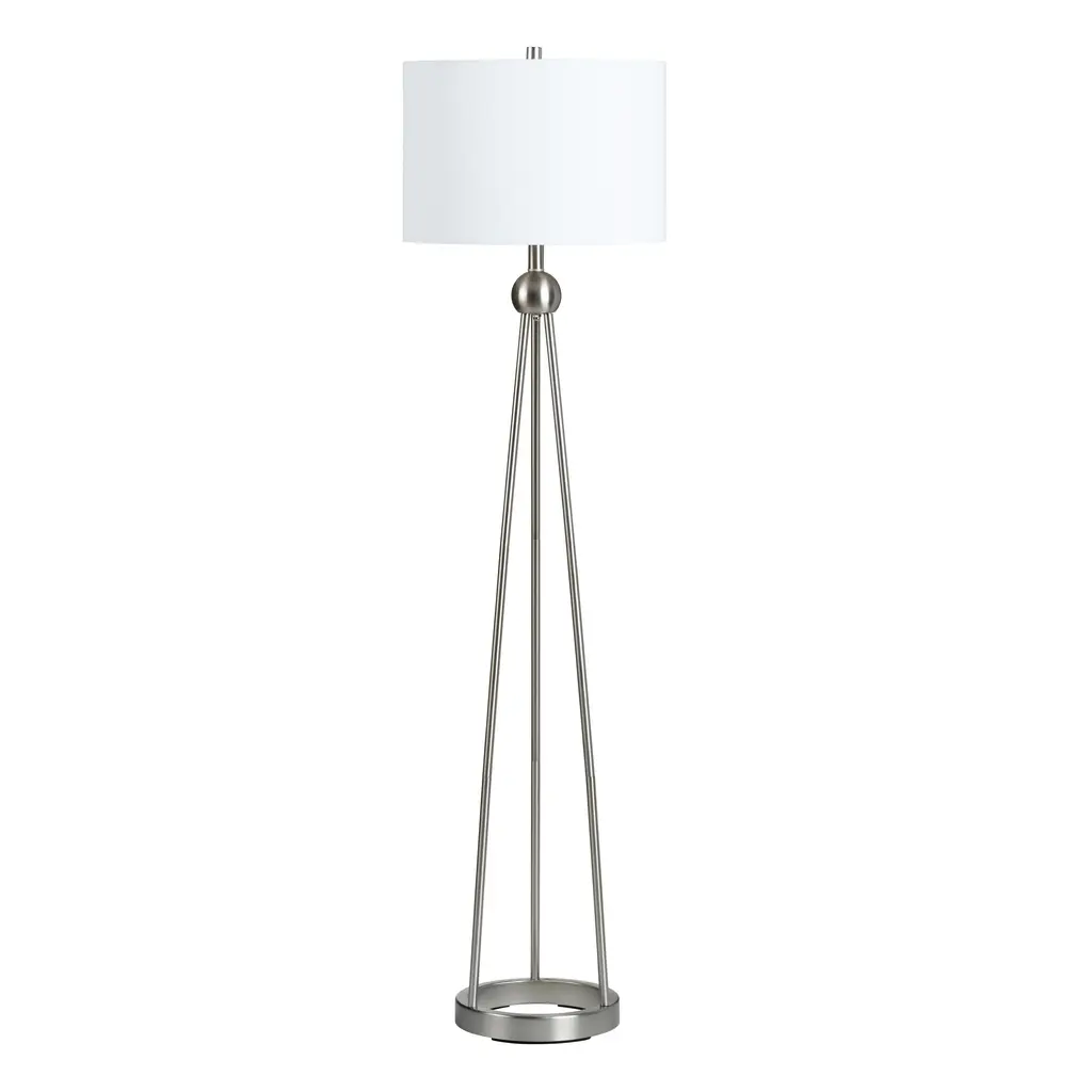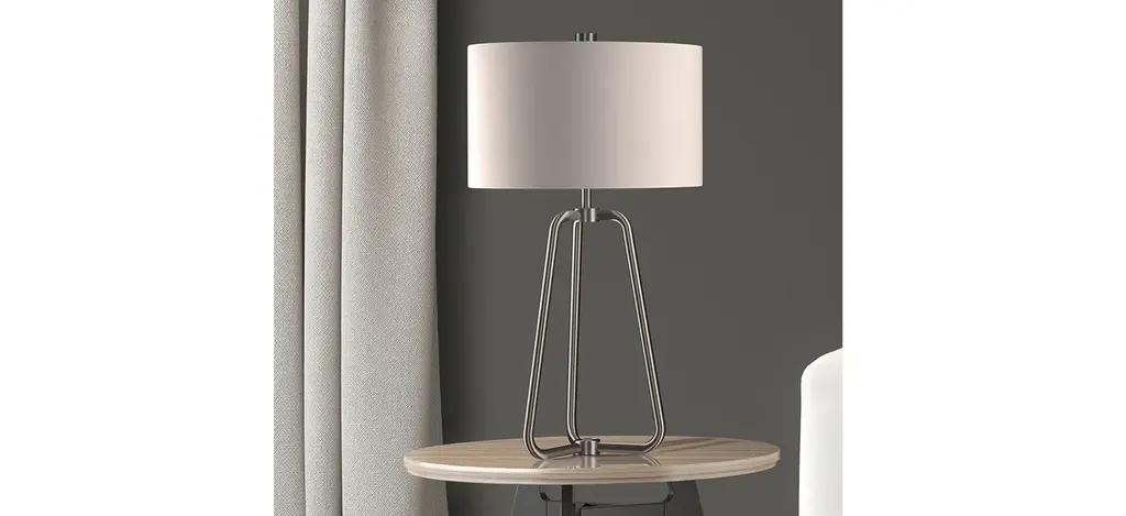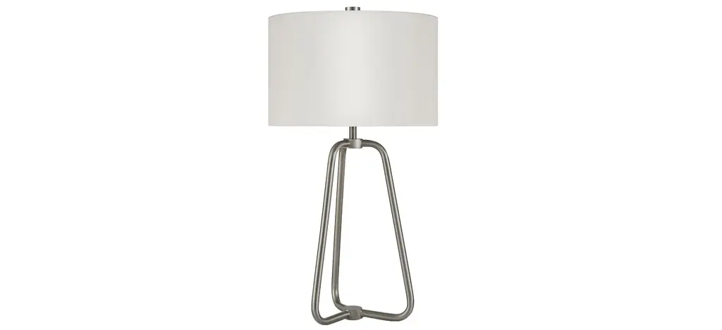 This brushed nickel lamp is an update on mid-century modern design, with an appealing blend of curves and angles. Handcrafted in sleek brushed nickel finish, this lamp adds refinement to any space. It is paired with a French Drum shade.