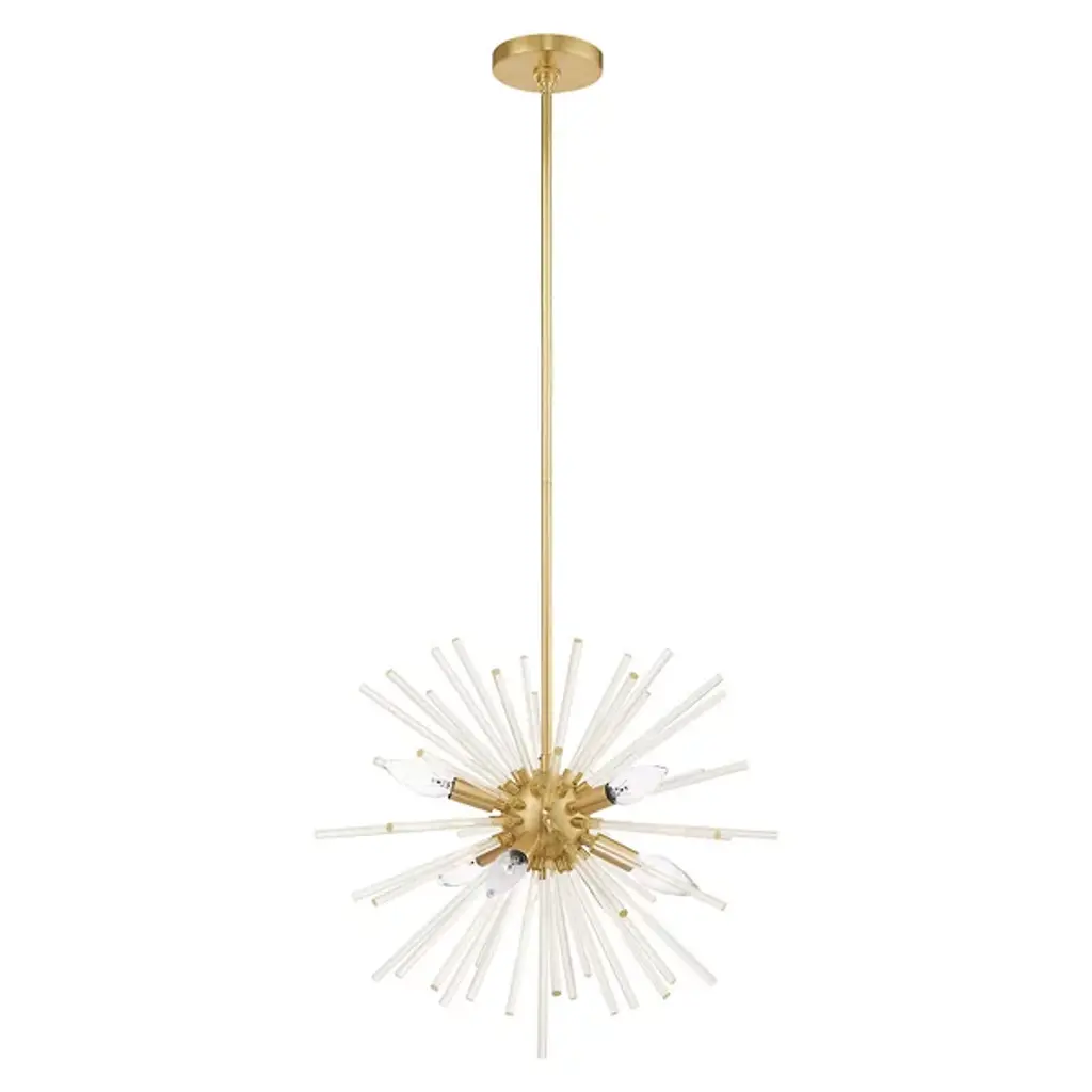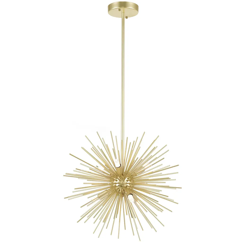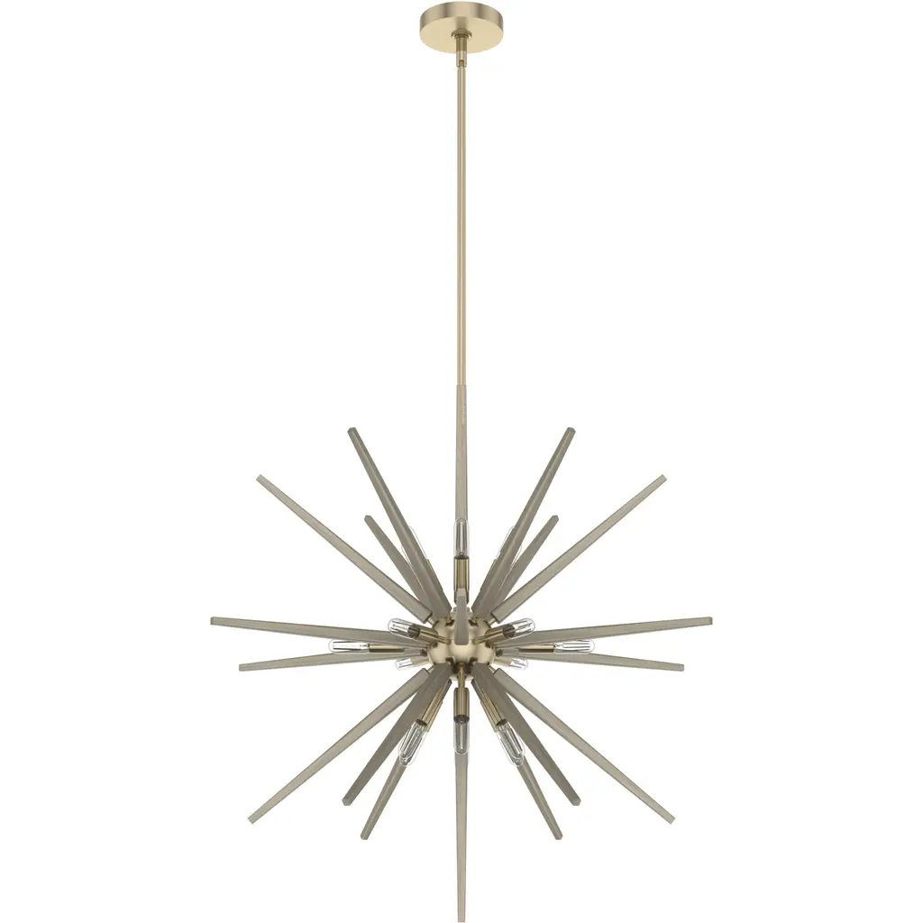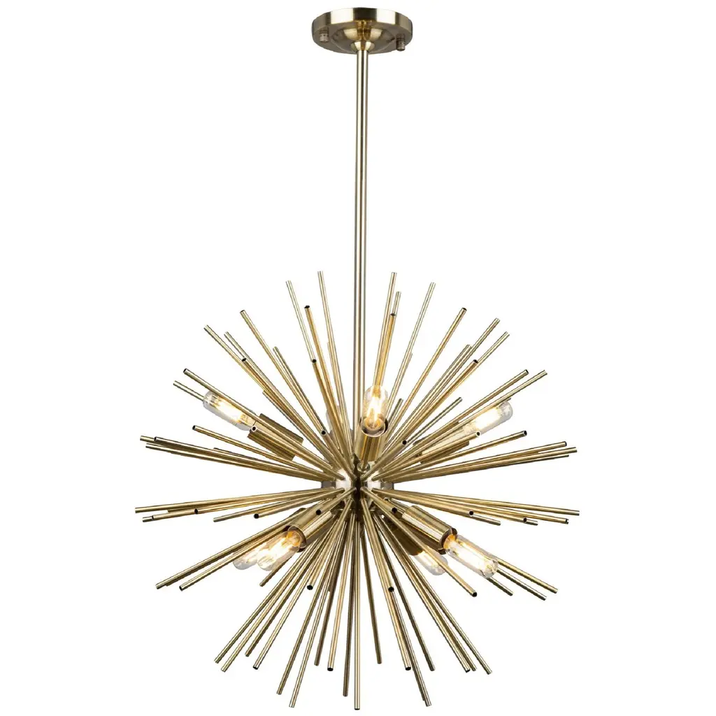 Stylish and sculptural. The Mariann Grand Chandelier from Alder & Ore greets all who view it with a glittering display of Sputnik style, whether placed in daylight or illuminated at night. A midcentury modern design secured by a small disc canopy with a boldly beveled edge, it uses a spherical accent at the base of a long downrod to suspend a series of slender cylindrical housings held across each other at different angles. A damp-listed candelabra-style lamp blooms from the upper and lower ends of each housing, extending a bright glow that sparkles off the smooth metalwork around it.