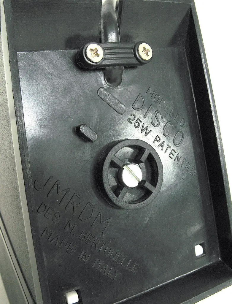 Iconic Mario Bertorelle Disco lamp for JMRDM Massanzago. Adjustable molded plastic disc. 15-25 watt E-14 (European bulb) or higher if LED/CFL.Tested original E-14 bulb European socket, cord, on/off switch, and grounded north American plug. Minor tarnish, dings, scuffs, bends and/or patination as largely seen in the photos and noted only for accuracy. Not ULC listed, but recommended ULC listing available from authorized 3rd party vendor upon request for an additional fee.