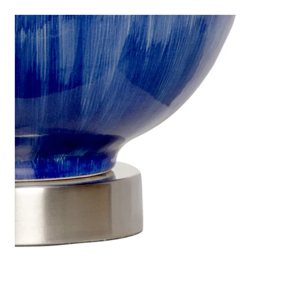 ENZO LAMP. CERAMIC URN SHAPE DESIGN WITH COBALT BLUE GLAZE AND A BRUSHED NICKEL MOUNT WITH A USB PORT.
